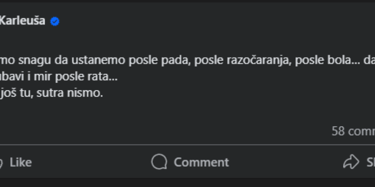 "Da svi nađemo snagu da ustanemo posle pada, posle razočaranja, posle bola... Da svi nađemo ljubav posle ljubavi i mir posle rata... Jer danas smo još tu, sutra nismo", napisala je Jelena Karleuša.