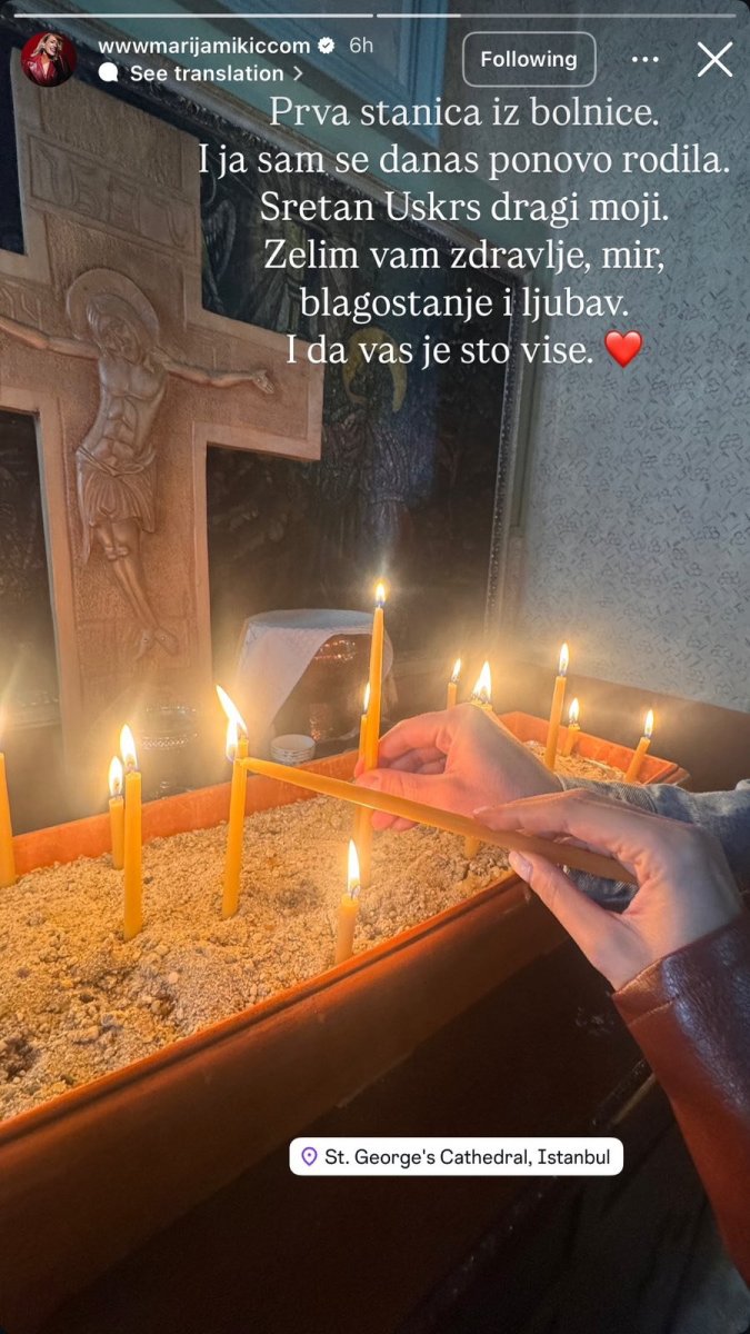 - Prva stanica iz bolnice. I ja sam se danas ponovo rodila. Sretan Uskrs, dragi moji. Želim vam zdravlje, mir, blagostanje i ljubav. I da vas je što više - napisala je ona, podelivši sliku iz crkve.