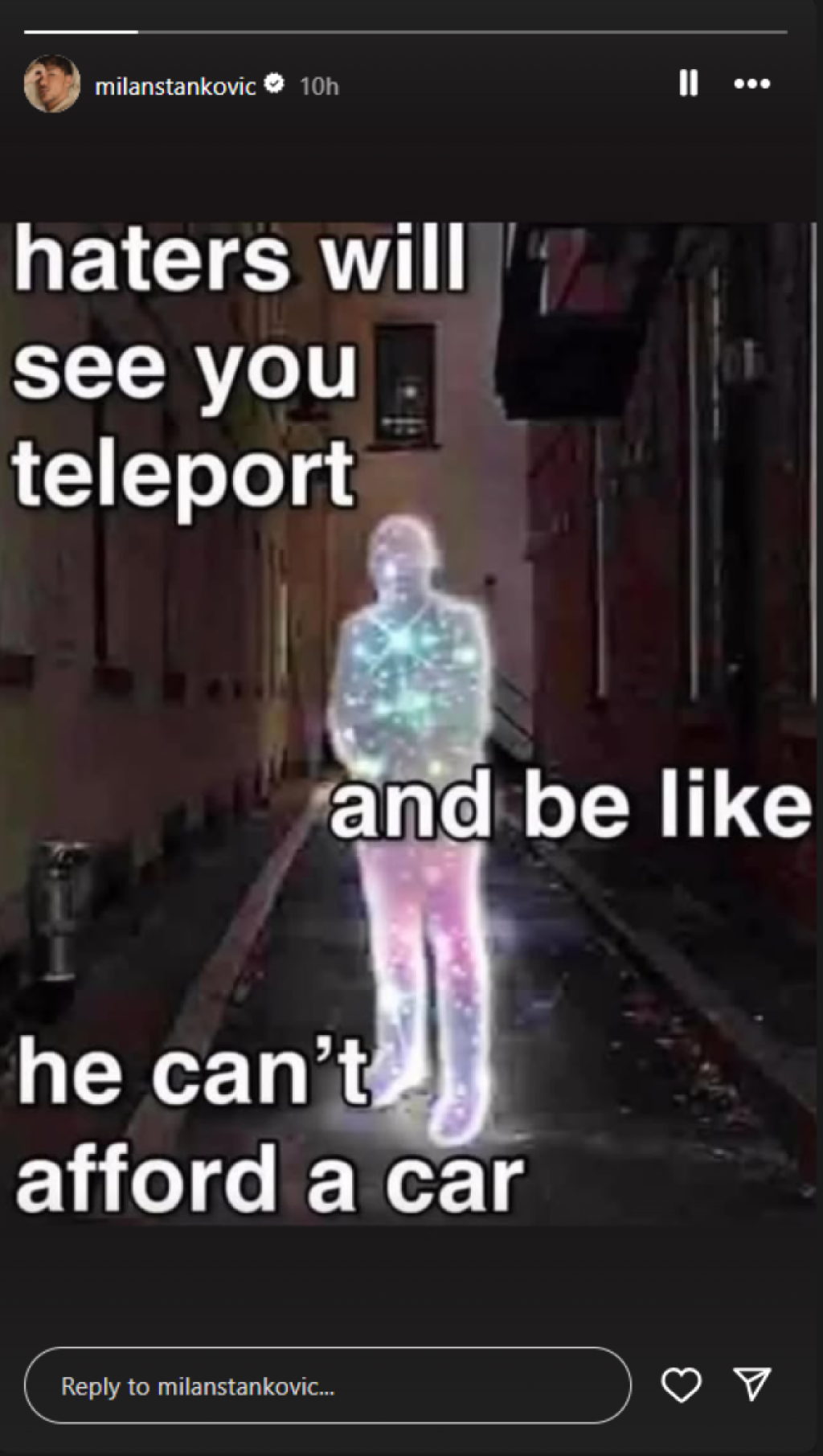"Hejteri će vas videti kako se teleportujete i misliće da ne može da priuštite auto sebi", piše u njegovoj objavi.