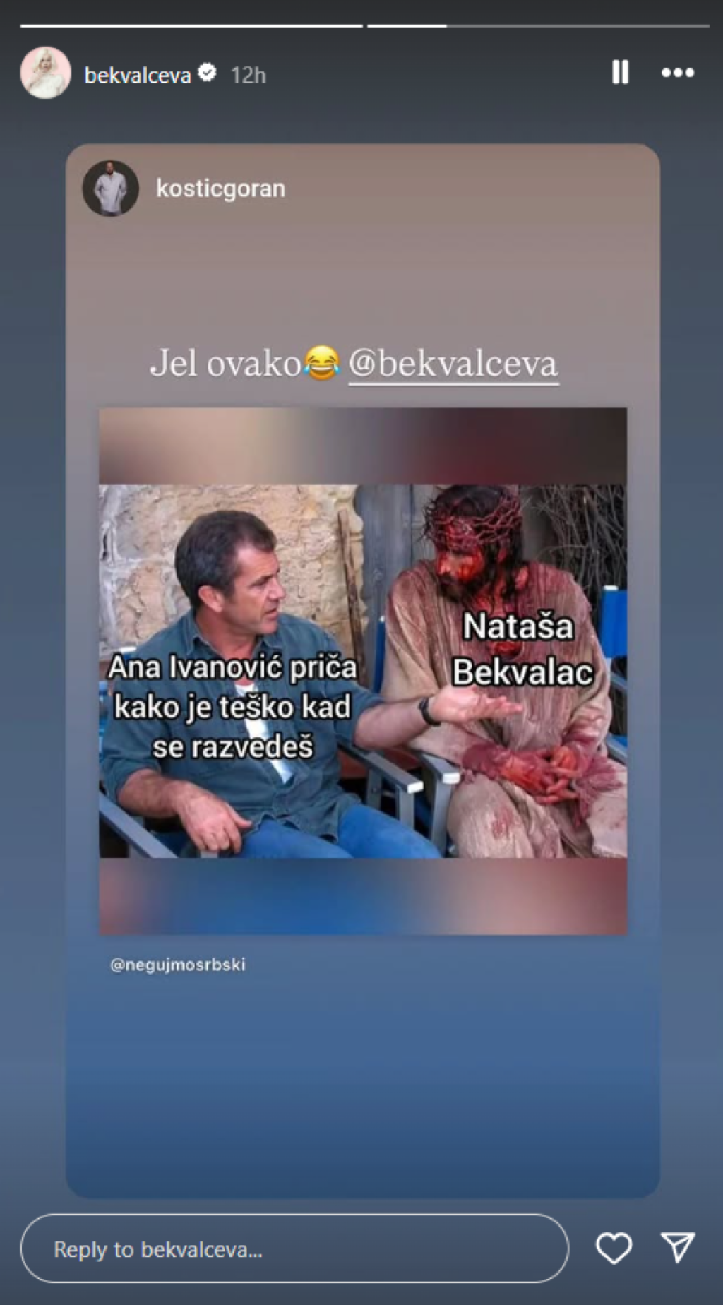 "Ana Ivanović priča kako je teško kad se razvedeš", pri čemu je lik Isusa metaforično predstavljen kao Bekvalčeva.