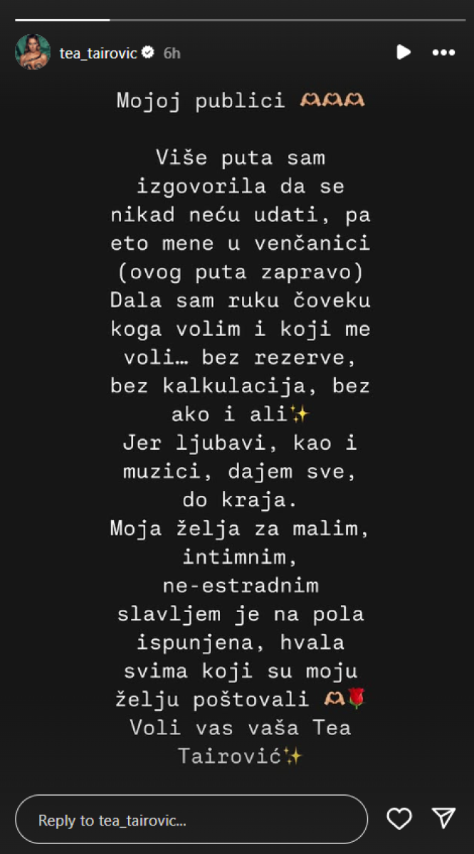 - Jer ljubavi, kao i muzici, dajem sve do kraja. Moja želja za malim, intimnim, ne - estradnim slavljem je na pola ispunjena. Hvala svima koji su moju želju poštovali. Voli vas vaša Tea Tairović.