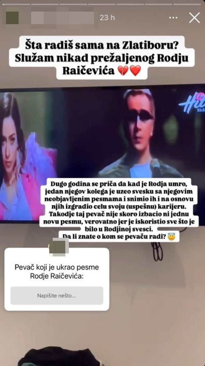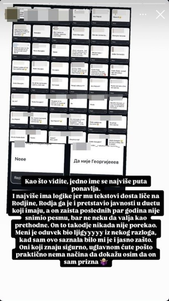 - Dugo godina se priča da je, kad je Rođa umro, jedan njegov kolega uzeo svesku sa njegovim neobjavljenim pesmama i snimio ih i na osnovu njih izgradio celu svoju (uspešnu) karijeru. Takođe, taj pevač nije skoro izbacio nijednu novu pesmu, verovatno jer je iskoristio sve što je bilo u Rođinoj svesci. Da li znate o kom se pevaču radi? - napisala je korisnica Instagrama, a na sledećem storiju je objavila rezultate i posebno istakla onaj na kojem piše da je u pitanju Vlado Georgiev: