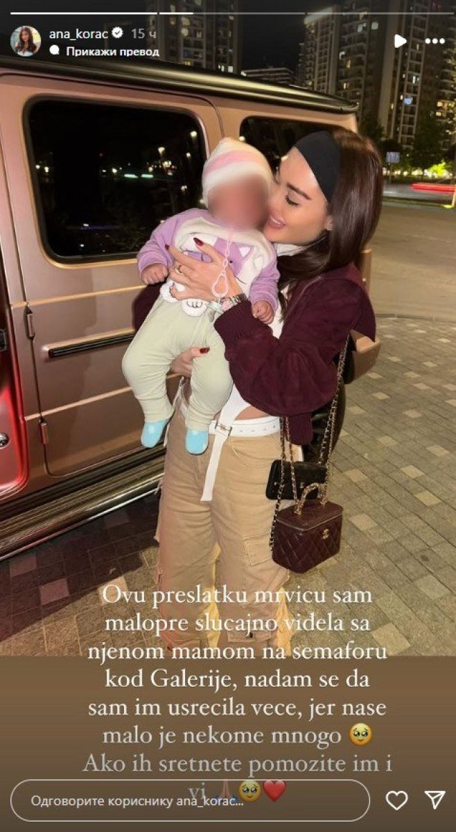- Ovu preslatku mrvicu sam malopre slučajno videla sa njenom mamom na semaforu kod tržnog centra, nadam se da sam im usrećila veče, jer naše malo je nekome mnogo. Ako ih sretnete pomozite im i vi - napisala je Ana Korać i dodala: