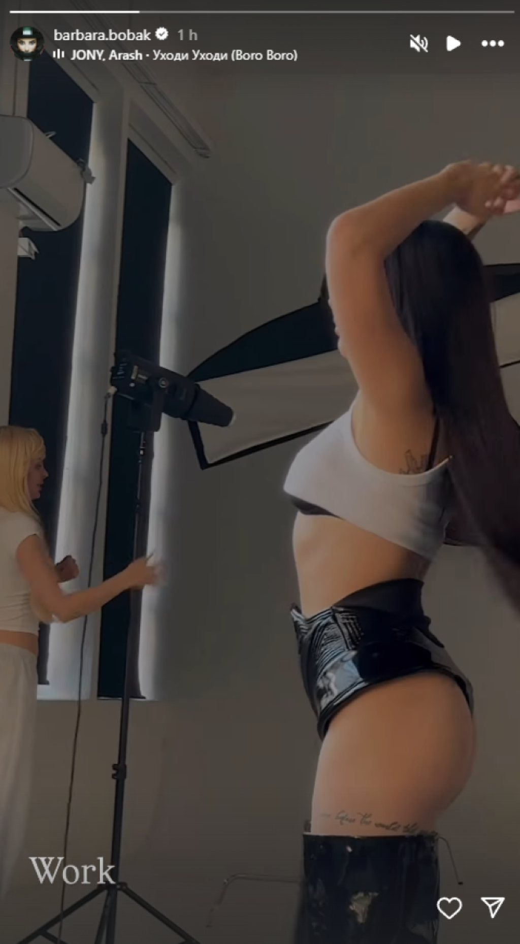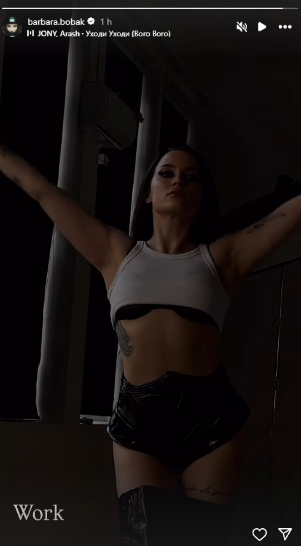 Naime, ona je pozirala u izazovnom kostimu - crnom šorcu od lateksa, dubokim čizmama od istog materijala, dok je beli, kratki topić prekrivao samo deo brushaltera.