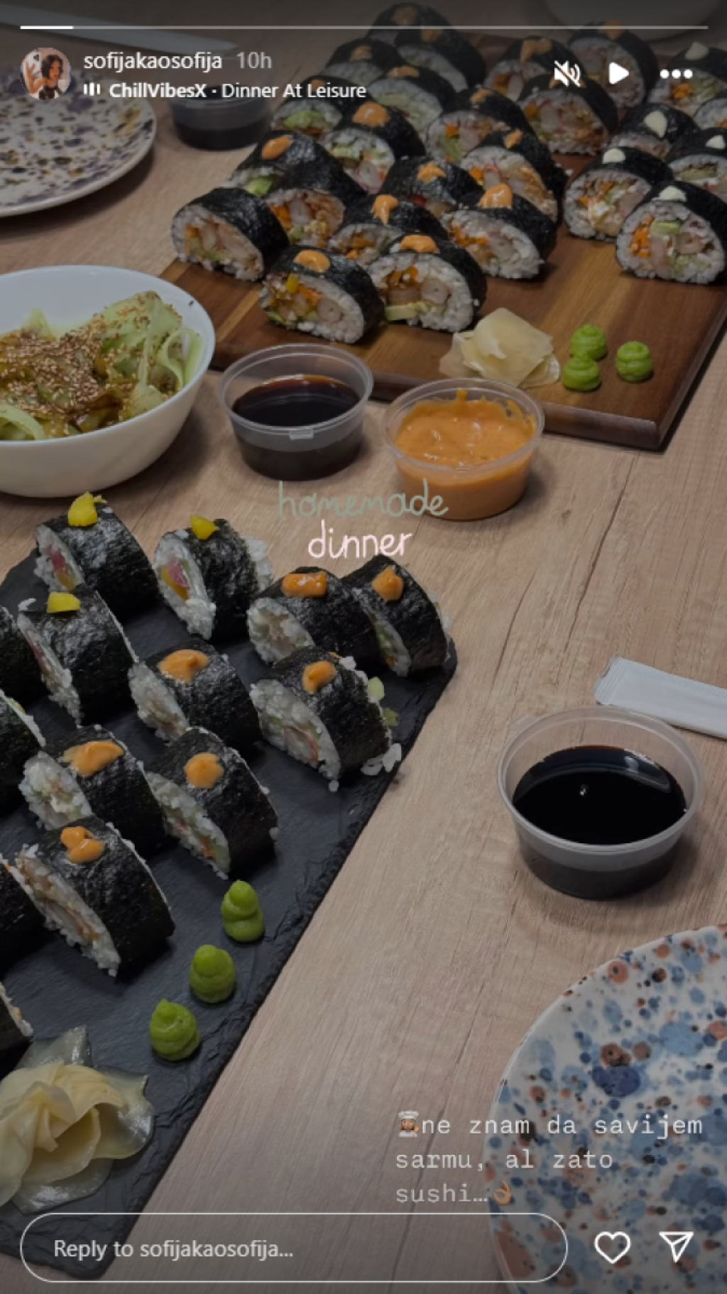 Na svom Instagram profilu Sofija je podelila fotografiju bogate trpeze, na kojoj je dominirao suši, spremljen s posebnom pažnjom i estetikom koja ne zaostaje za onom u vrhunskim restoranima.