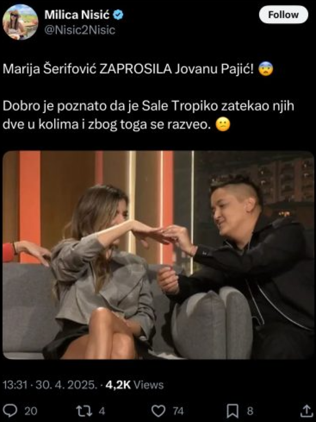 - Marija Šerifović zaprosila Jovanu Pajić. Dobro je poznato da je Sale Tropiko zatekao njih dve u kolima i zbog toga se razvelo.
