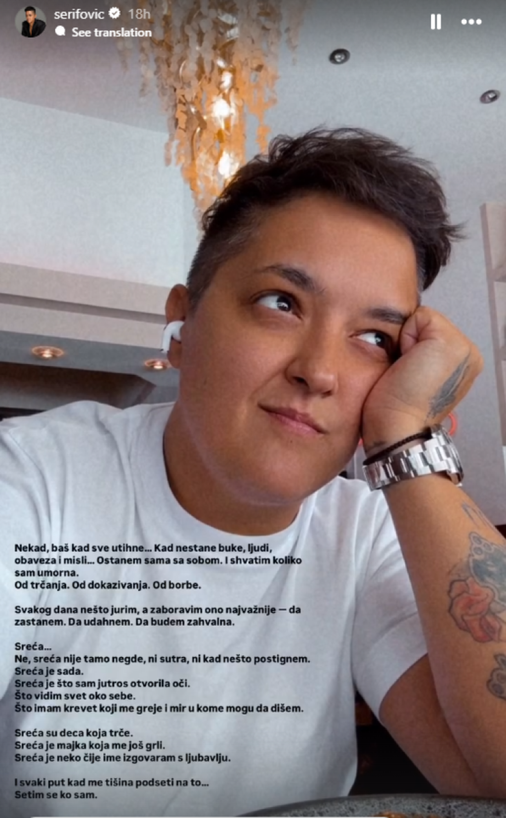"Nekad, baš kad sve utihne... Kad nestane buke, ljudi, obaveza i misli... Ostanem sama sa sobom. I shvatim koliko sam umorna. Od trajanja. Od dokazivanja. Od borbe. Svakog dana nešto jurim, a zaboravim ono najvažnije - da zastanem. Da udahnem. Da budem zahvalna. Sreća... Ne, sreća nije tamo negde, ni sutra, ni kad nešto postignem. Sreća je sada. Sreća je što sam jutros otvorila oči. Što vidim svet oko sebe. Što imam krevet koji me greje i mir u kome mogu da dišem. Sreća su deca koja trče. Sreća je majka koja me još grli. Sreća je neko čije ime izgovaram s ljubavlju. I svaki put kad me tišina podseti na to... Setim se ko sam", poručila je Marija na svom Instagramu.