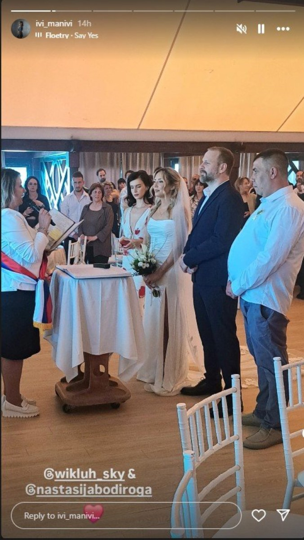 Skaj Vikler i lepa Nastasija dugo su zajedno, a verili su se pre dve godine. Njih dvoje zakleli su se juče na večnu ljubav, a fotografije i snimci sa venčanja osvanuli su na društvenim mrežama. Nakon što su mladenci izgovorili sudbonosno "da" slavili su sa prijateljima, a mikrofona se latio i mladoženja.