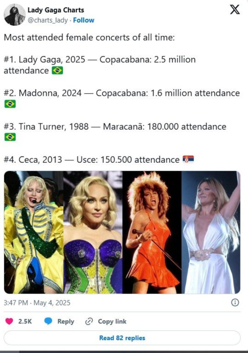 Na ovoj listi koja je posvećena samo ženskim izvođačima, ispred Cece ražnatović se nalaze Tina Tarner, Madona i sada Lejdi Gaga, koja je srušila rekord.