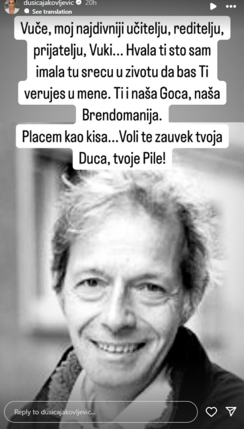 "Vuče, moj najdivniji učitelju, reditelju, prijatelju Vuki... Hvala ti što sam imala tu sreću u životu da baš ti veruješ u mene. Ti i naša Goca. Plačem kao kiša. Voli te zauvek tvoja Duca, tvoje pile. Bože, koliko boli", napisala je voditeljka Pinka na Instagramu.