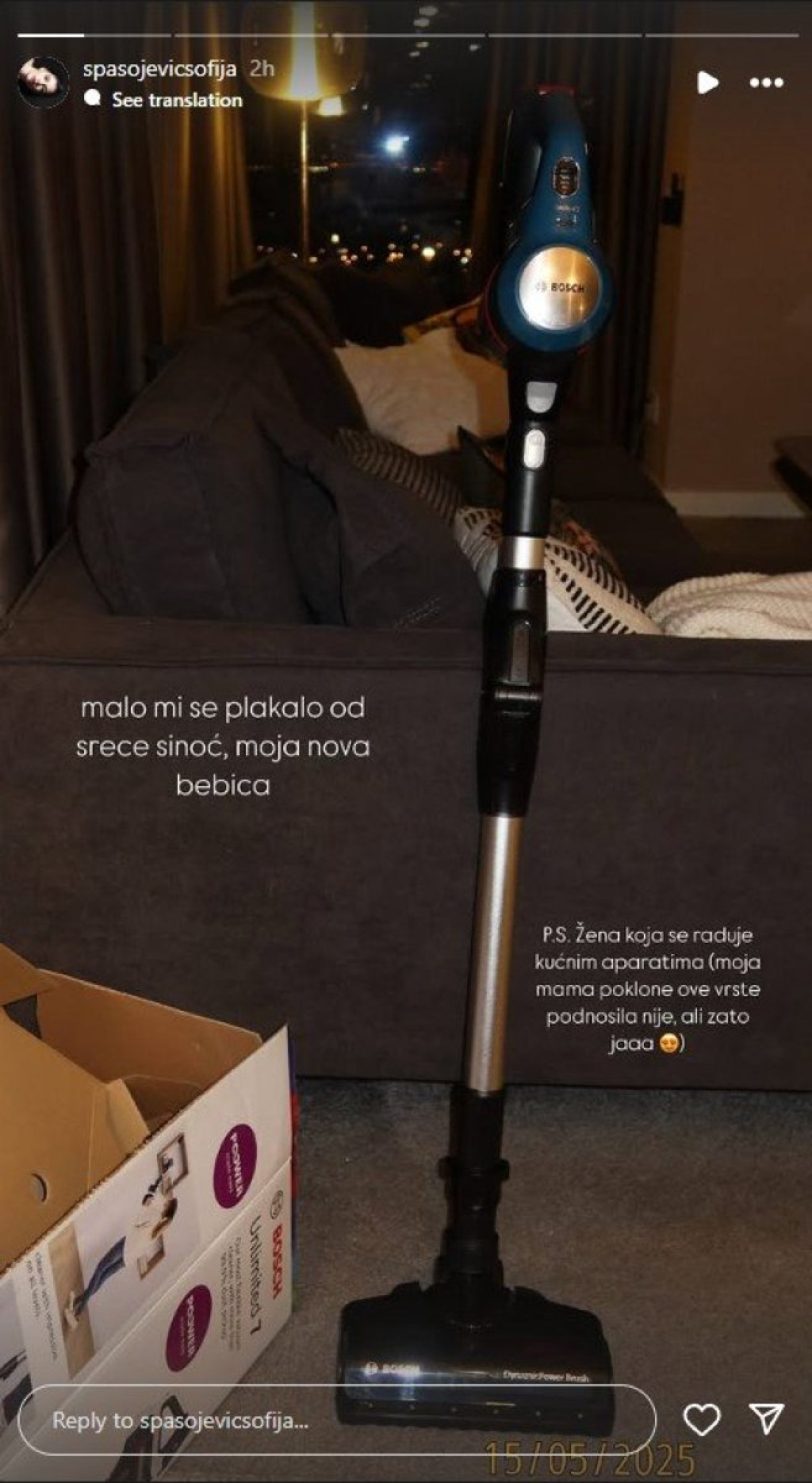 Ovoga puta, Sofija Spasojević se putem društvene mreže Instagram pohvalila poklonom koji je dobila. Reč je o usisivaču poslednje generacije koji omogućava veliku fleksibilnost, slobodu kretanja i dostizanje svih uglova u njenom domu.