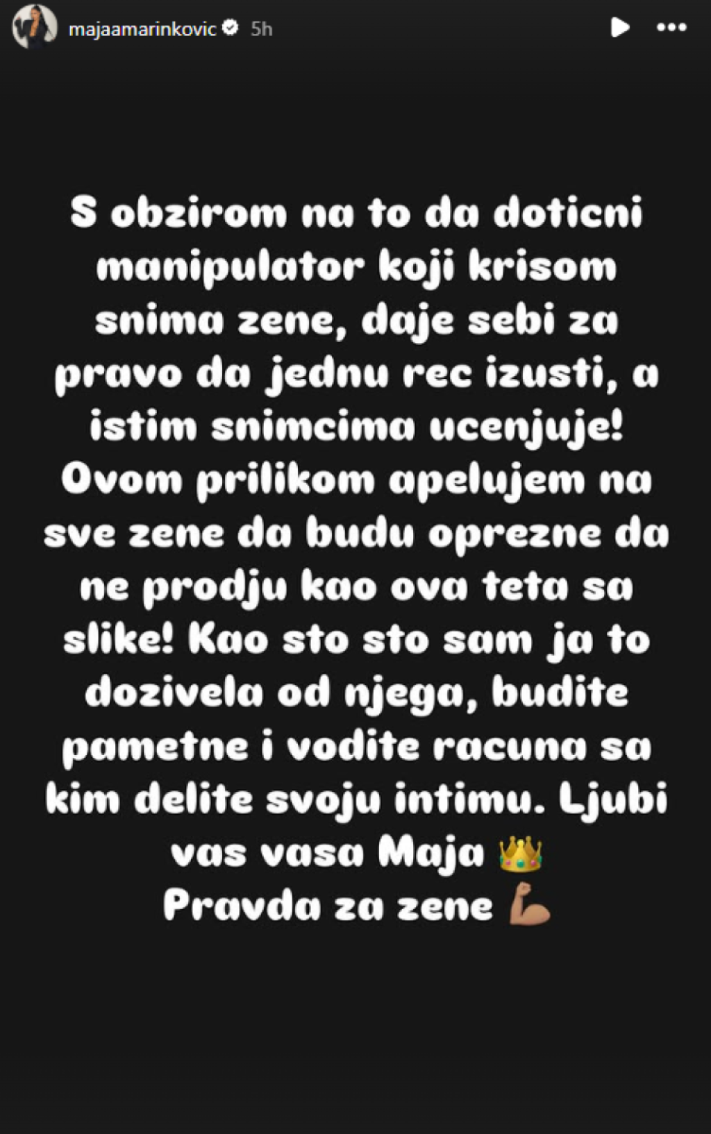 "S obzirom na to da dotični manipulator koji krišom snima žene, daje sebi za pravo da jednu reč izusti, a istim snimcima ucenjuje! Ovom prilikom apelujem na sve žene da budu oprezne. Budite pametne i vodite računa sa kim delite svoju intimu. Ljubi vas vaša Maja i pravda za žene", zaključila je Maja Marinković.