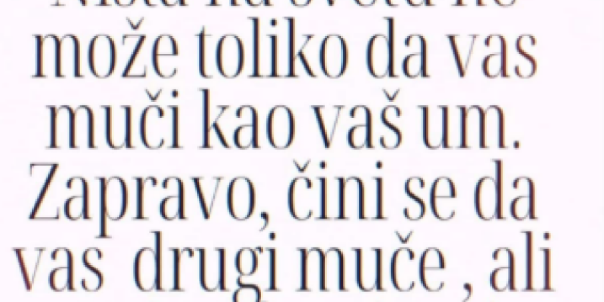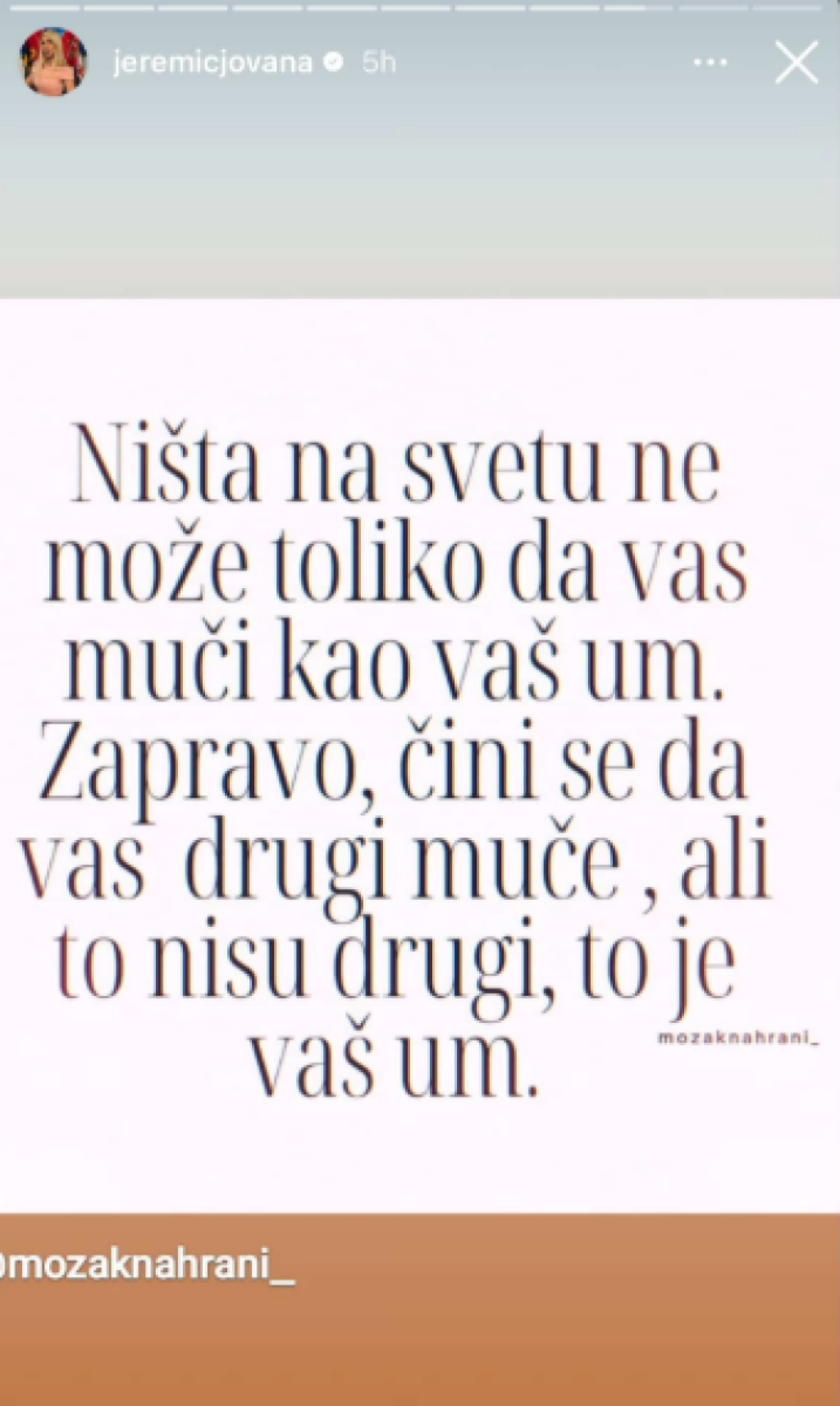- Ništa na svetu ne može toliko da vas muči kao vaš um. Zapravo, čini se da vas drugi muče, ali to nisu drugi, to je vaš um - napisala je Jovana Jeremić koja i pored silnih problema uspeva da ostane fokusirana i uspešna u svom poslu.