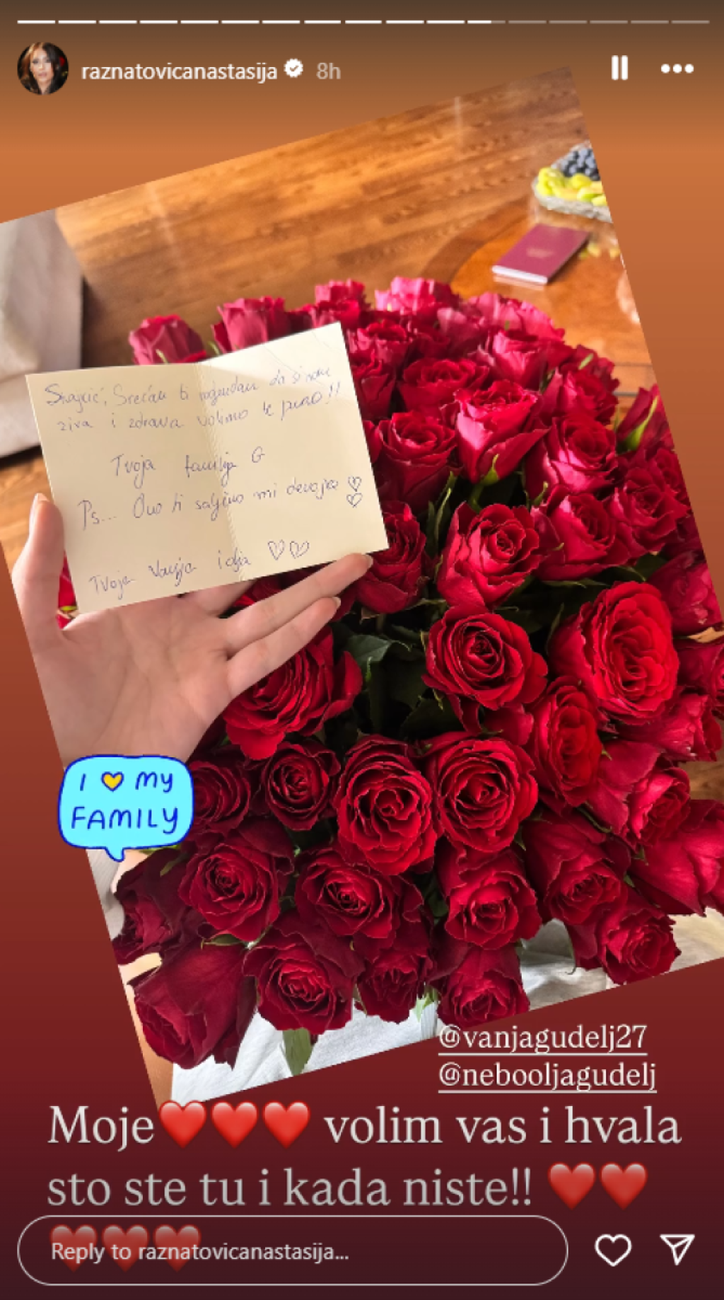 – Snajkić, srećan ti rođendan! Da si nam živa i zdrava, volimo te puno. Tvoja familija! Ovo ti šaljemo mi devojke, tvoje Vanja i Olja – navodi se u čestitki.