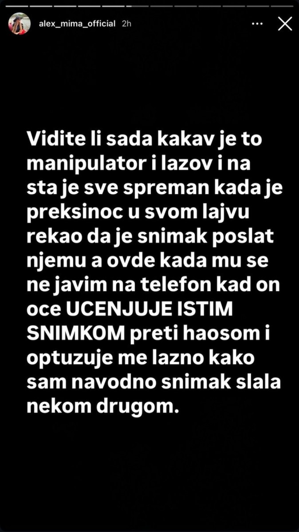 - Vidite li sada kakav je to manipulator i lažov i na šta je sve spreman kada je preksinoć u svom lajvu rekao da je snimak poslat njemu, a ovde kada mu se ne javim na telefon kad hoće, ucenjuje me istim snimkom, preti haosom i optužuje me lažno kako sam navodno snimak slala nekom drugom - poručila je Aleksandra Nikolić.
