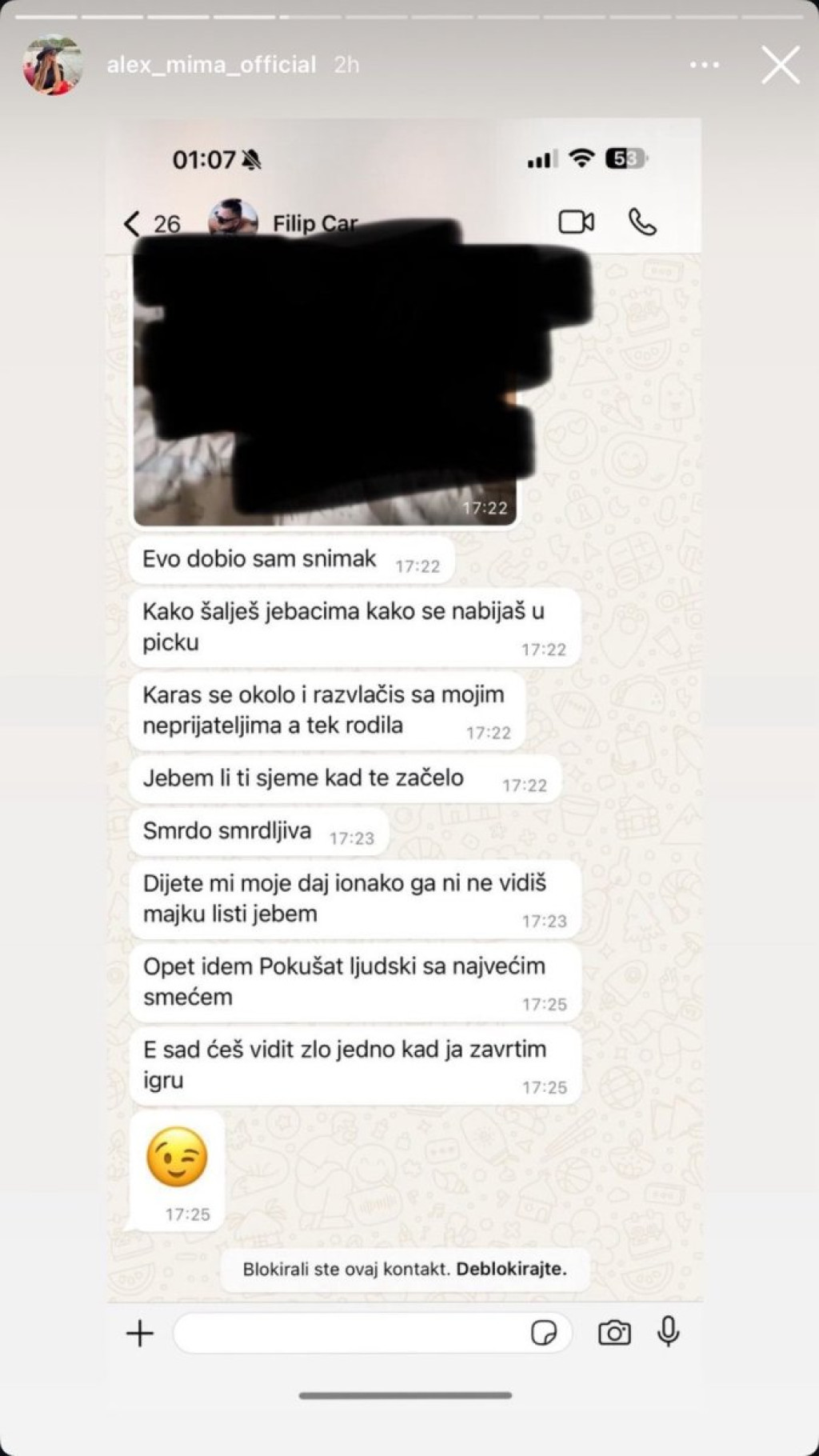 - Jagodina koju spominje, bila sam na rođendanu kod drugarice, a u porukama možete videti kako me naziva i šta mi je sve pisao.U sledećih par storija se vidi kako me je ucenjivao snimcima, pretio mi, a pošto laže i za policiju i bolnicu, evo i za to dokaza.
