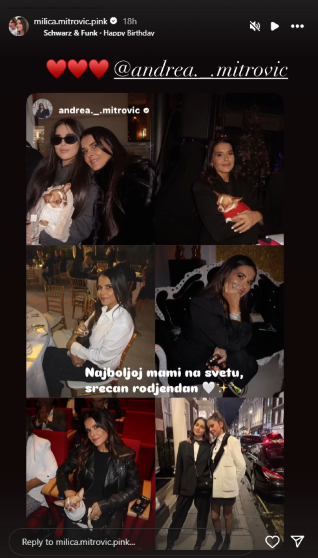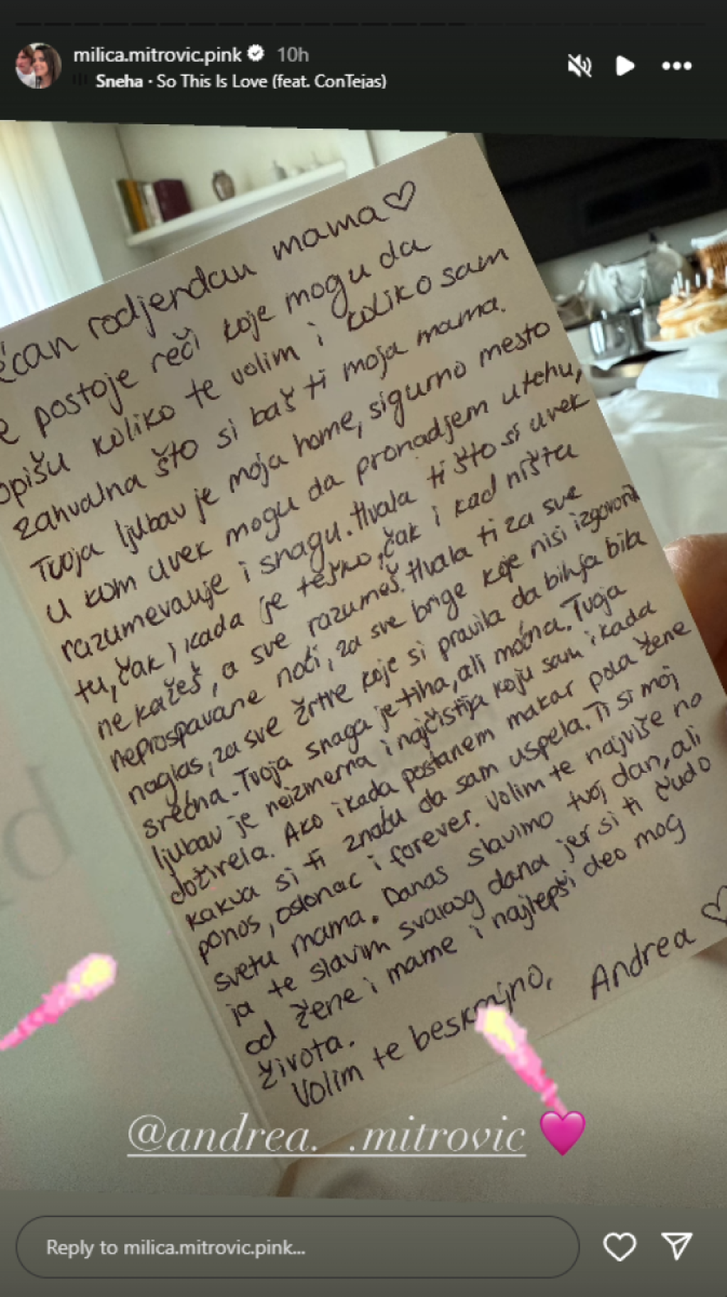 "Srećan rođendan mama. Ne postoje reči koje mogu da opišu koliko te volim i koliko sam zahvalna što si baš ti moja mama. Tvoja ljubav je moja kuća, sigurno mesto u kom uvek mogu da pronađem utehu, razumevanje i snagu. Hvala ti što si uvek tu, čak i kada je teško, čak i kada ništa ne kažeš a sve razumeš. Hvala ti za sve neprospavane noći, za sve brige koje nisi izgovorila naglas, za sve žrtve koje si pravila da bih ja bila srećna. Tvoja snaga je tiha ali moćna. Tvoja ljubav je neizmerna i najčistija koju sam ikada doživela. Ako ikada postanem makar pola žene kakva si ti znaću da sam uspela. TI si moj ponos, oslonac, i forever. Volim te najviše na svetu mama. Danas slavimo tvoj dan, ali ja te slavim svakoga dana jer si ti čudo od žene i mame i najlepši deo mog života. Volim te beskrajno. Andrea" glasila je čestitka.