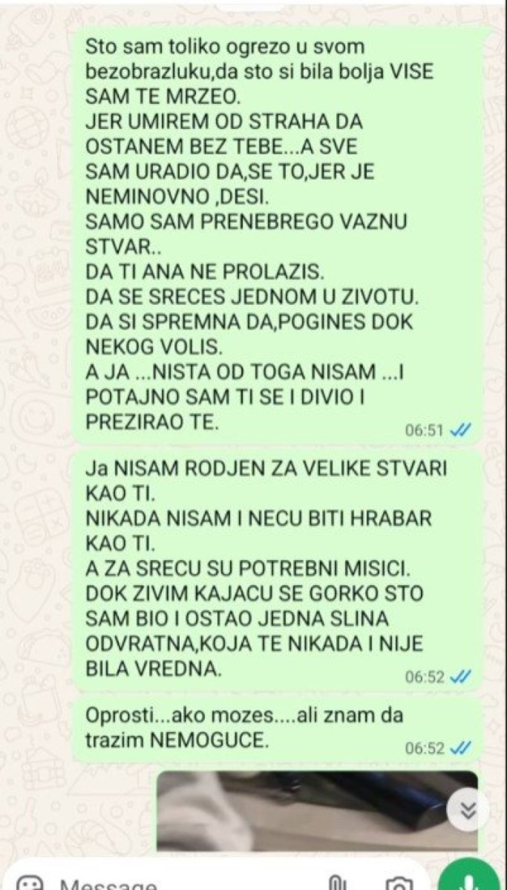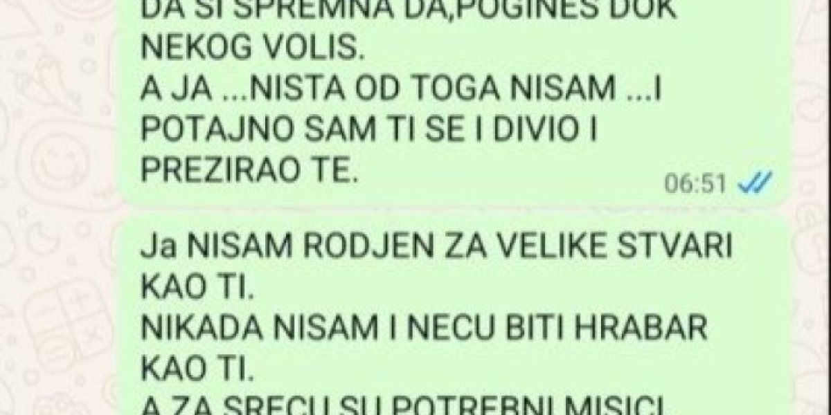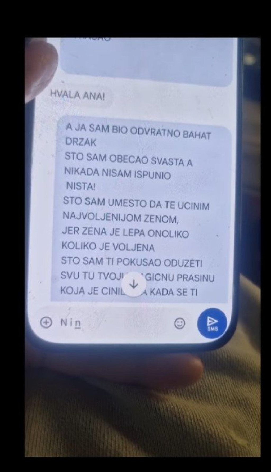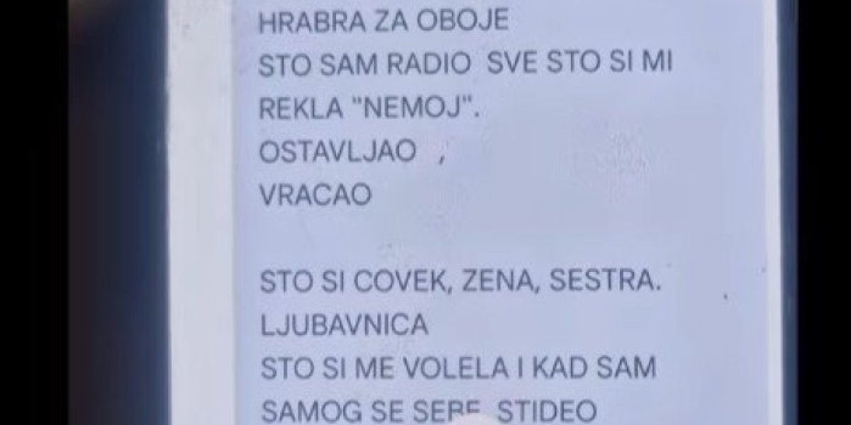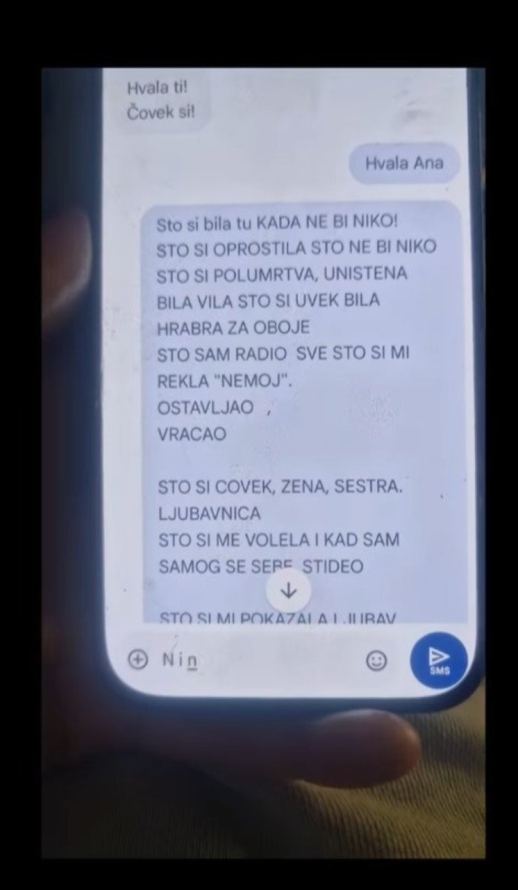 "Hvala Ana, što si bila tu kad nije niko, što si oprostila što ne bi niko, što si polumrtva, uništena bila vila, što si uvek bila hrabra za oboje, što sam radio sve što si mi rekla "nemoj", ostavljao, vraćao... Što si čovek, žena, sestra, ljubavnica... Što si me volela i kad sam samog sebe mrzeo...", glasi jedna od poruka, koja se nastavlja sledećim tekstom: