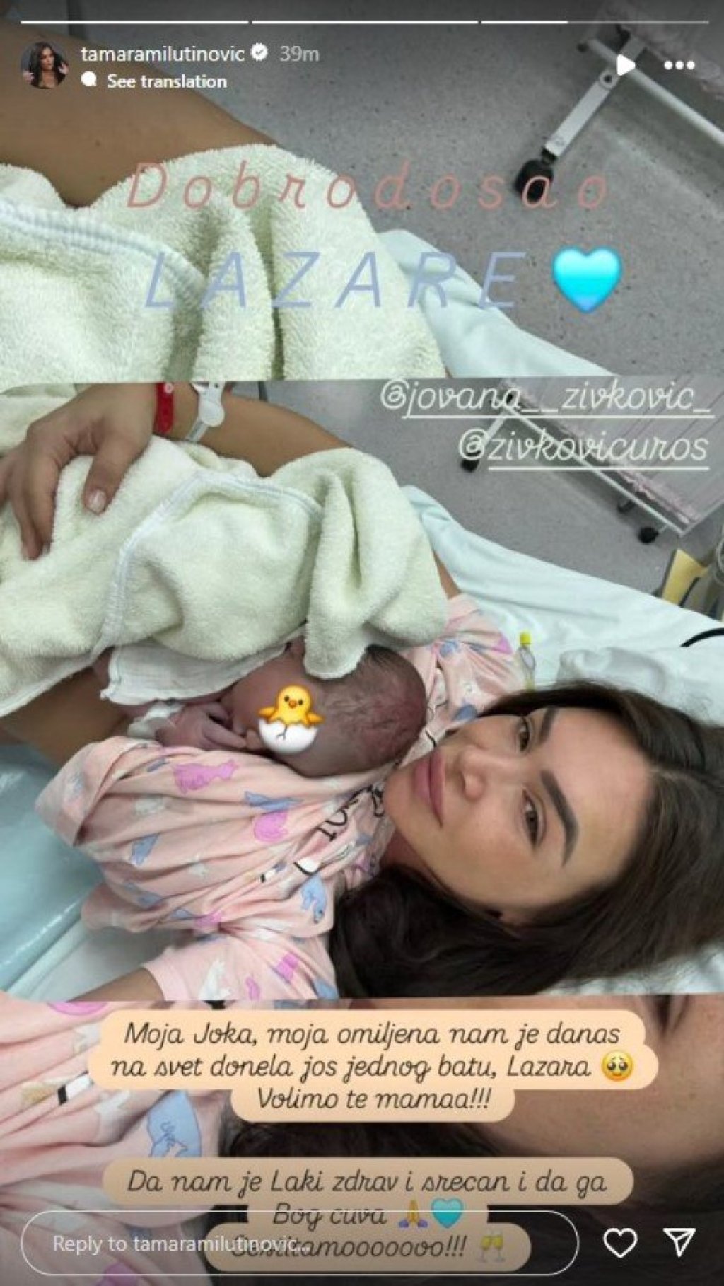 "Moja Joka, moja omiljena nam je danas na svet donela još jednog batu Lazra. Volimo te mama. Da nam je Laki zdrav i srećan i da ga Bog čuva. Čestitamo", poručila je pevačica Urošu i Jovani.