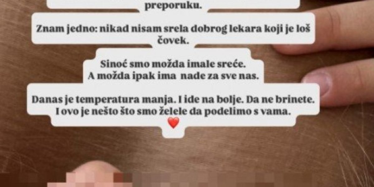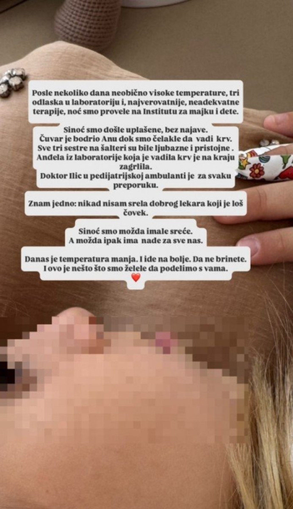 - Posle nekoliko dana neobično visoke temperature, tri odlaska u laboratoriju, i, najverovatnije, neadekvatne terapije, noć smo provele na Institutu za majku i dete. Sinoć smo došle uplašene, bez najave. Čuvar je bodrio Anu dok smo čekale da vadi krv. Sve tri sestre na šalteru su bile ljubazne i pristojne. Znam jedno, nikad nisam srela dobrog lekara koji je loš čovek. Sinoć smo imale sreće. Danas je temperatura manja. I ide na bolje. Da ne brinete - napisala je Aleksandra Jeftanović koja se zahvatila svima koji su bili zabrinuti za njenu mezimicu.