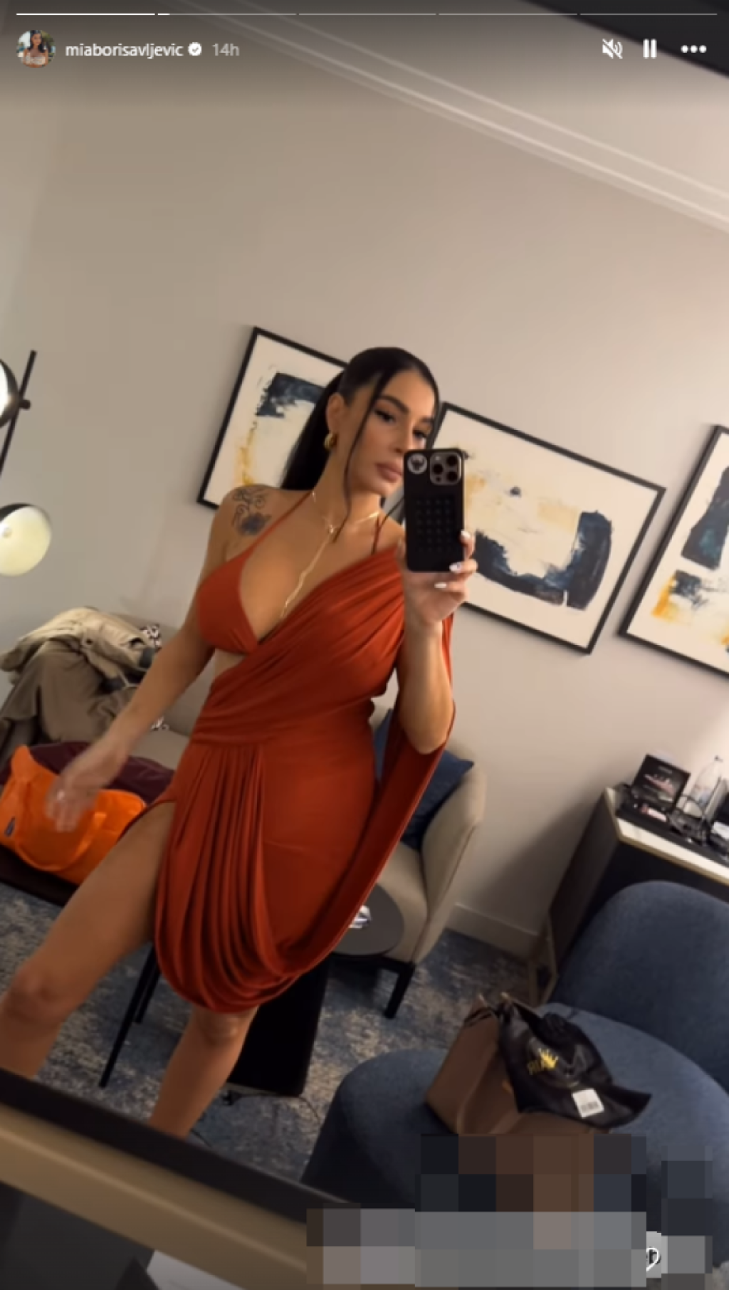 Međutim, ono što je privuklo najviše pažnje jeste Miina haljina neobičnog kroja. Pevačica je za ovu priliku odabrala haljinu Meline Džinović i to jarko crvene boje. Zanimljivo je da haljina nema jedno rame, već sa te strane izgleda kao brushalter u istoj nijansi. Sa druge strane, duboki šlic otkriva Miine zanosne obline.