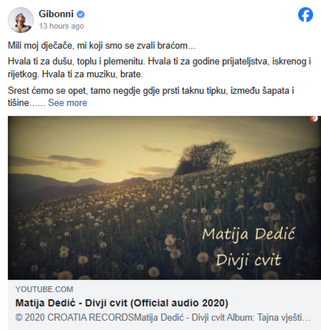"Dragi moj dečače, mi koji smo sebe nazivali braćom. Hvala ti na duši, toploj i plemenitoj. Hvala ti na godinama prijateljstva, iskrenog i retkog. Hvala ti na muzici brate. Srešćemo se ponovo, negde gde prsti dodiruju dirku, između šapata i tišine... Tvoj Gibo te voli", napisao je pevač na Fejsbuku.