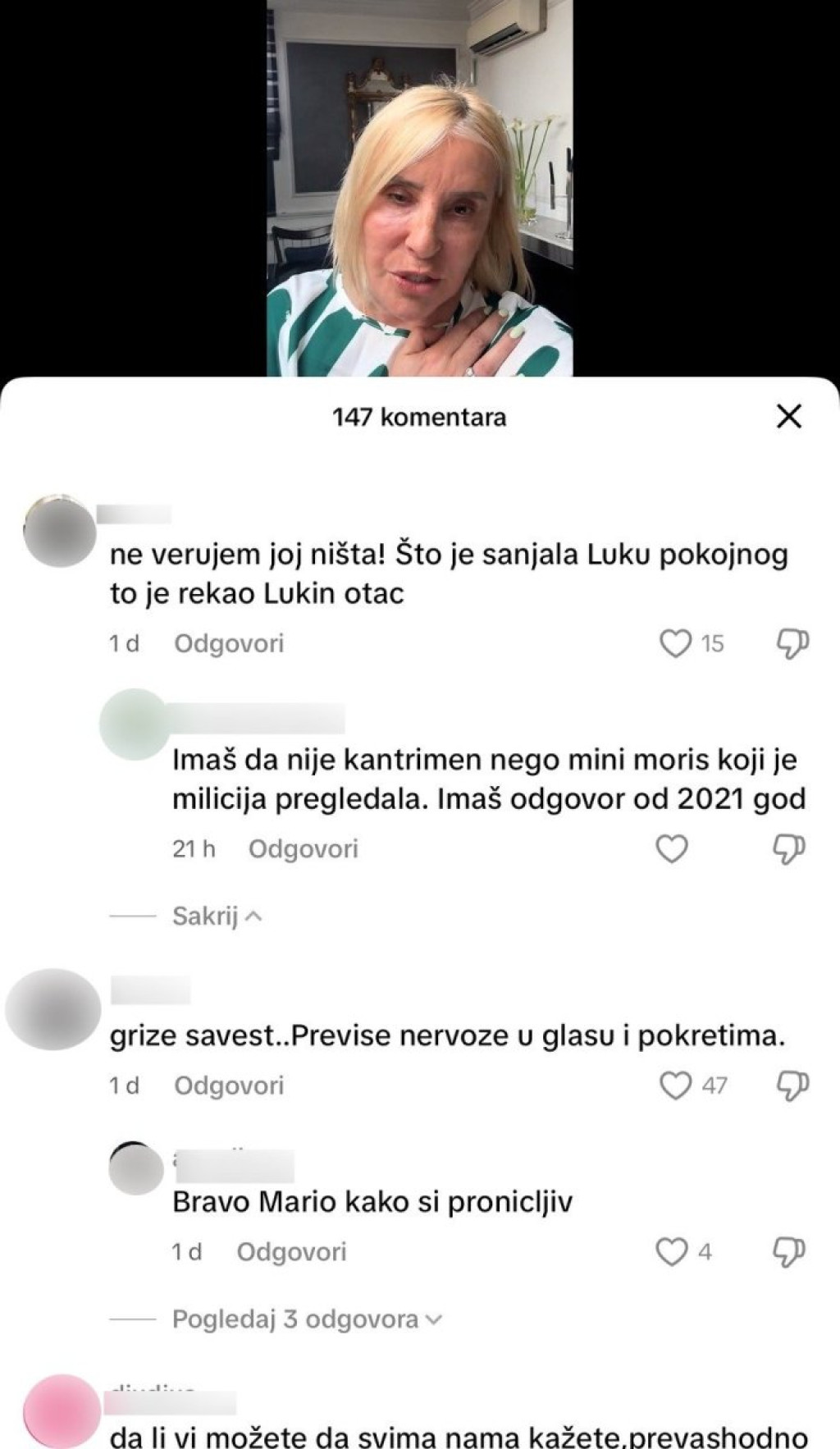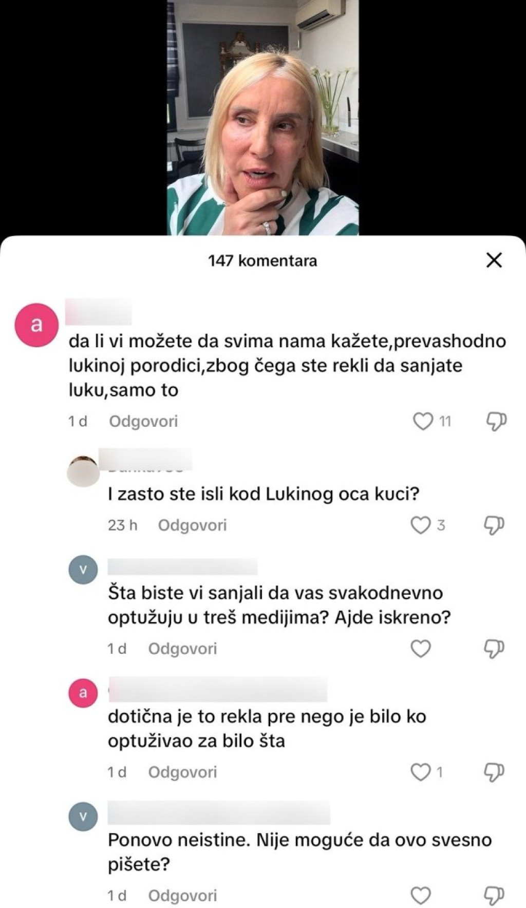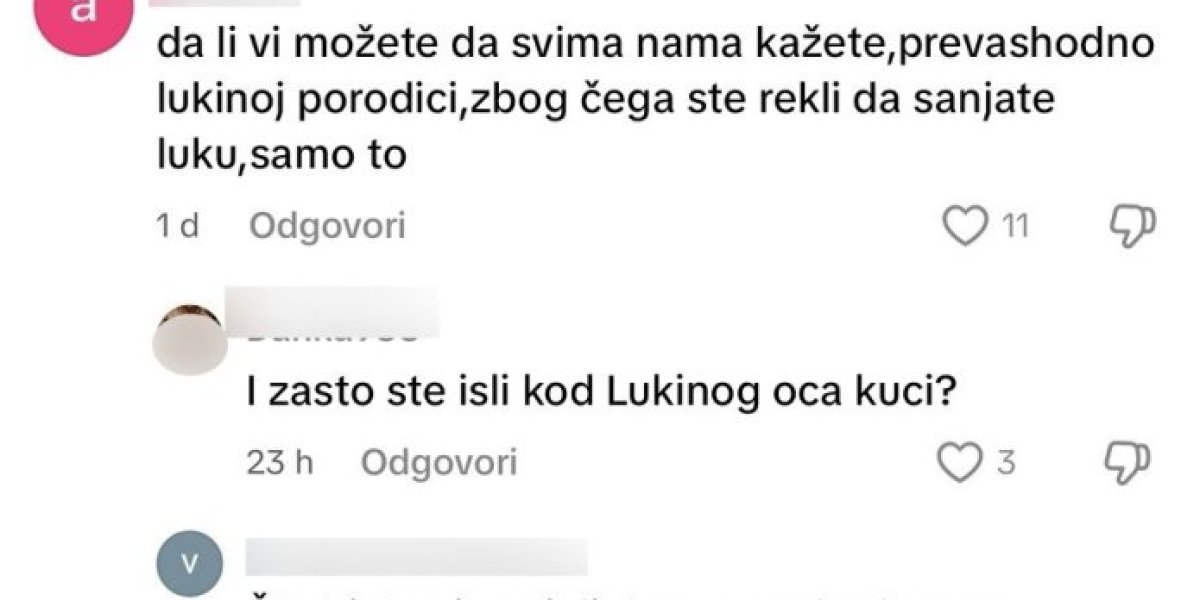 "Grize savest. Previše nervoze u glasu i pokretima", "Samo ste vi imali taj automobil u to vreme", "Luka je išao sa mnom u odeljenje! Istina se zna", "Niko nikada nije pomenuo Vašu decu, nego samo vas", "Da li možete da nam kažete zbog čega ste rekli da sanjate Luku?", "Zašto ste išli kod Lukinog oca kući?", "Glasine su bile da ste vi lično vozili, ništa ne insinuiram, samo kažem", "Nikad i niko nije decu spominjao, već vas. I gde se bilo te noći, ruta kojom se auto kretao...", samo su neki od komentara.