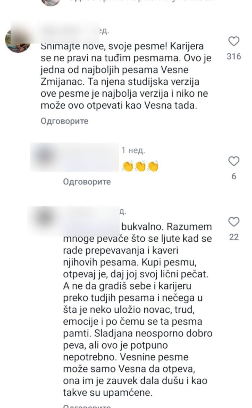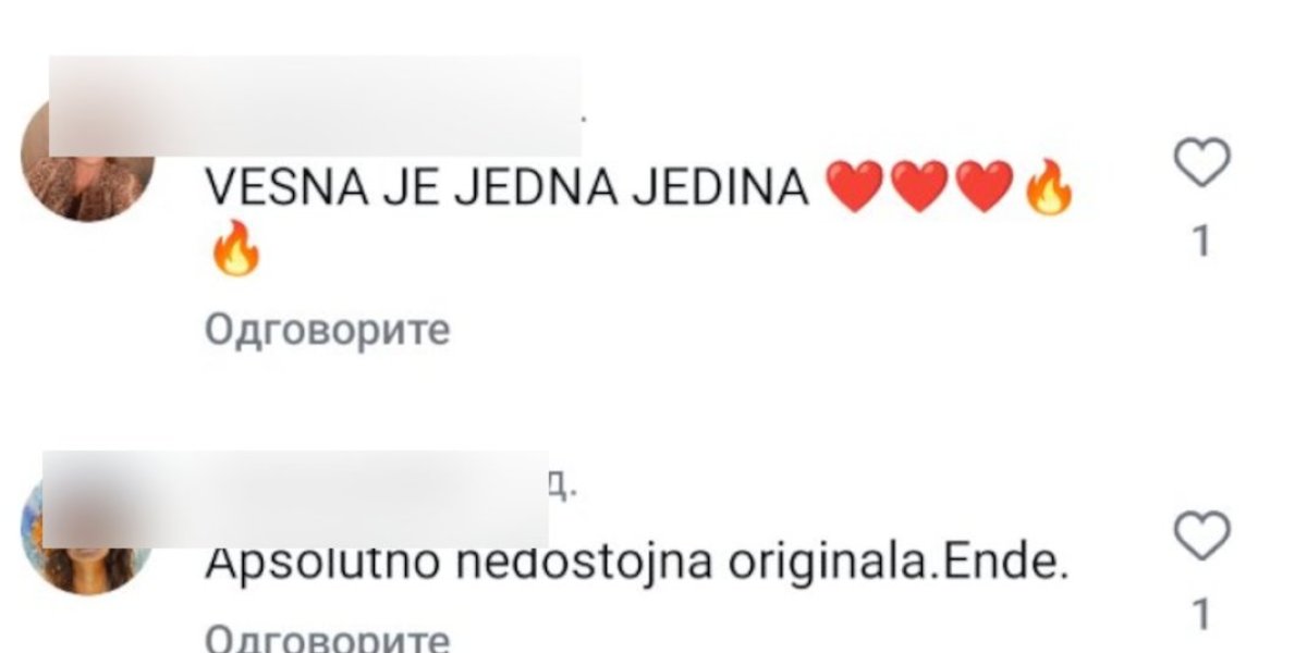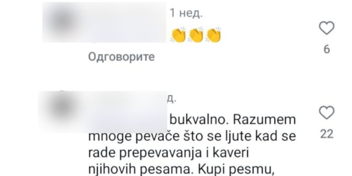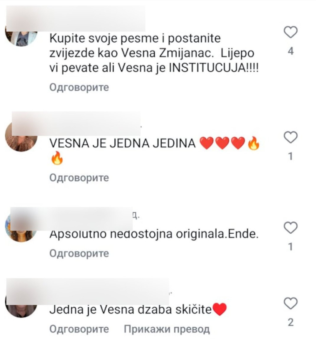 "Vesna je Vesna...ti si pokušaj", "Snimajte nove, svoje pesme! Karijera se ne gradi na tuđim pesmama. Ovo je jedna od najboljih pesma Vesne Zmijanac. Ta njena studijska verzija ove pesme je najbolja i niko je ne može otpevati kao Vesna tada", "Kupi pesmu, otpevaj je, daj joj lični pečat, a ne da gradiš sebe i karijeru preko tuđih leđa", "Jedna je Vesna, džaba skičite", "Nedostojno originala", samo su neki od komentara publike.
