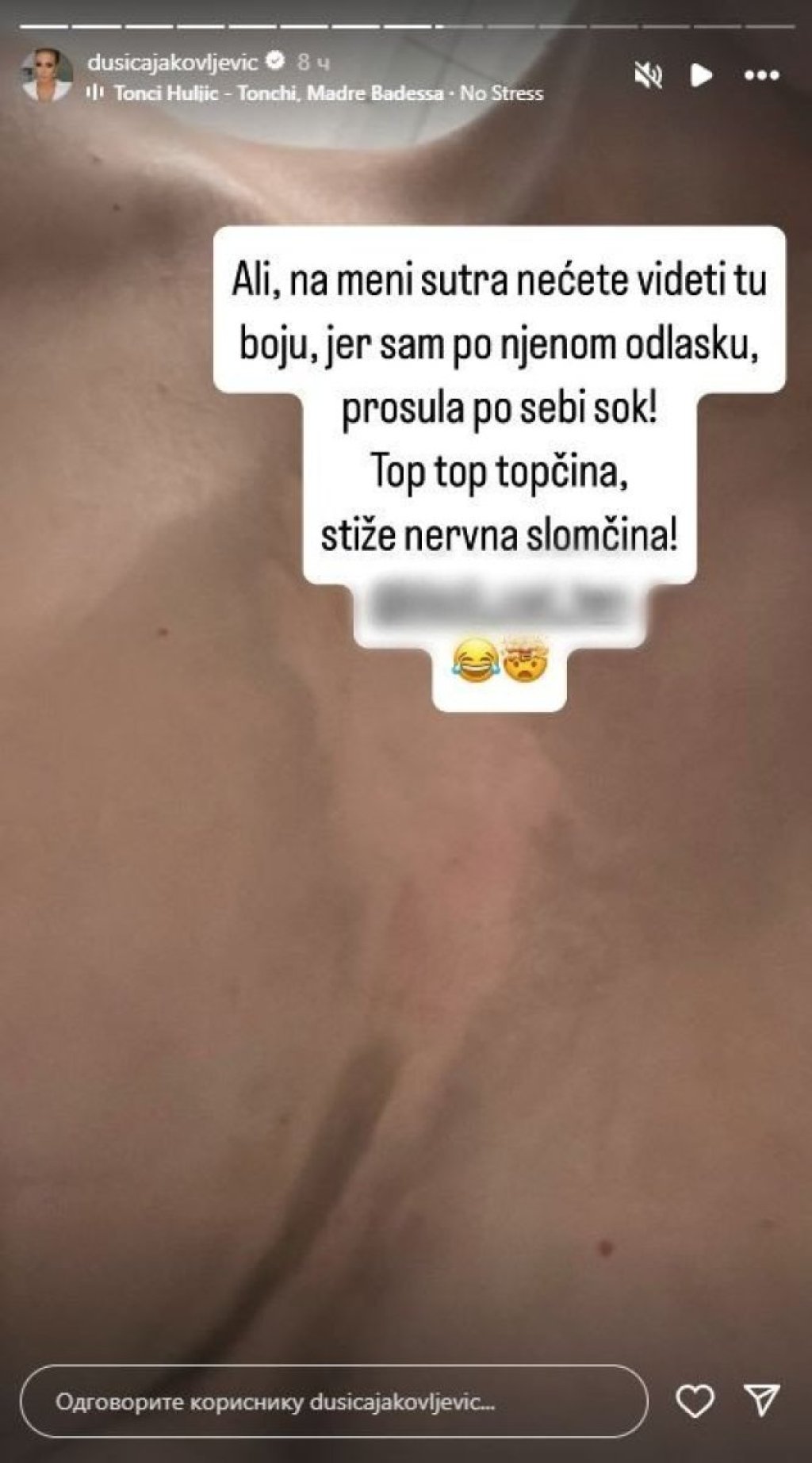 "Na meni sutra nećete videti boju, jer sam prosula po sebi sok! Top, top, topčina stiže nervna slomčina", napisala je voditeljka na storiju.