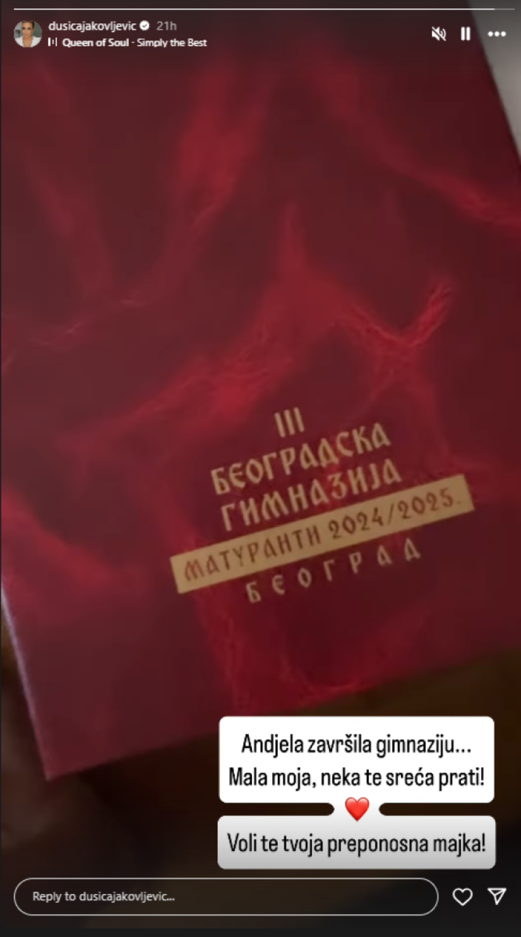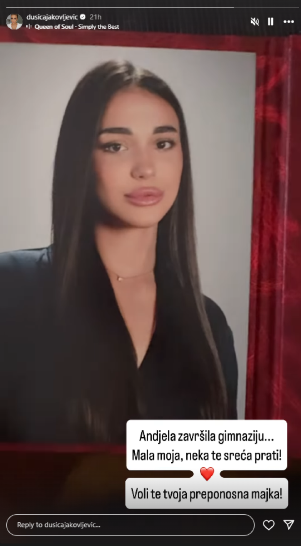 "Anđela završila gimnaziju... Mala moja, neka te sreća prati! Voli te tvoja preponosna majka", obratila se Dušica naslednici.