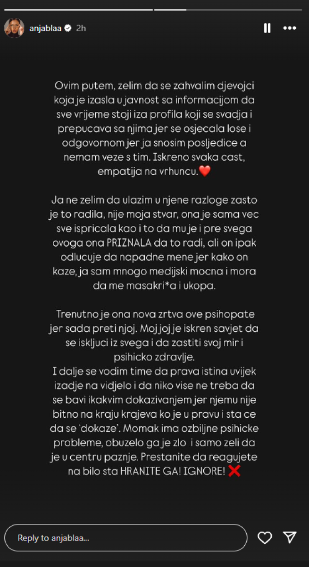 "Ovim putem želim da se zahvalim devojci koja je izašla u javnost sa informacijom da sve vreme stoji iza profila koji se svađa i prepucava sa njima, jer se osećala loše i odgovornom zato što ja snosim posledice, a nemam veze s tim. Iskreno, svaka čast, empatija na vrhuncu", napisala je Anja, pa nastavila: