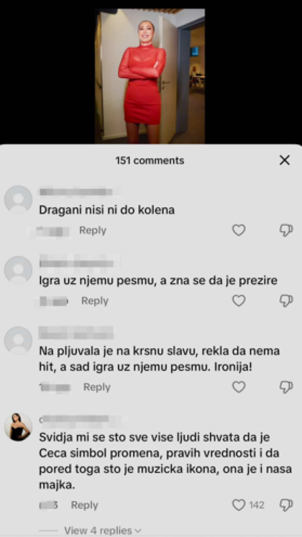 ''Dragani nisi ni do kolena'', ''Igra uz njenu pesmu, a zna se da je prezire'', ''Napljuvala je na krsnu slavu, rekla da nema hit, a sada igra uz njenu pesmu'', bili su samo neki od komentara.