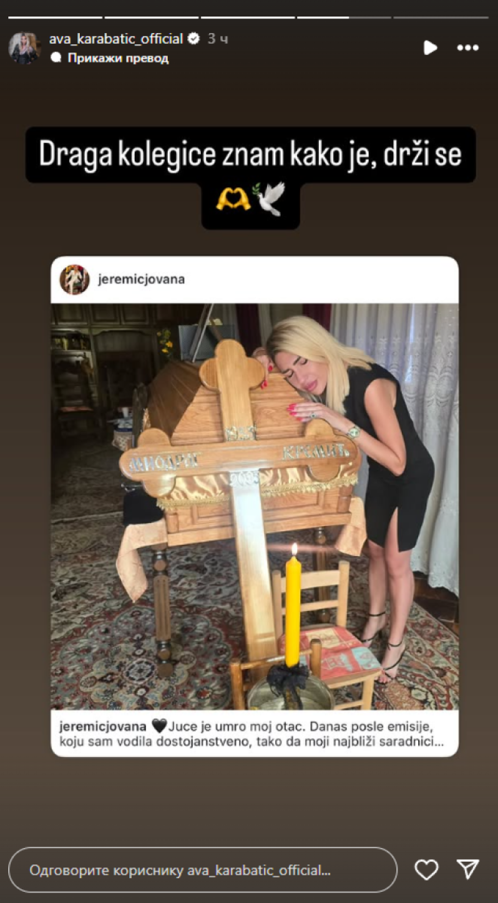 Inače pored porodice i prijatelja, veliki oslonac u ovim trenucima Jovani je i njen bivši suprug Vojislav Milošević koji se javno oprostio od Miodraga, što je Jeremićevu dodatno dirnulo.