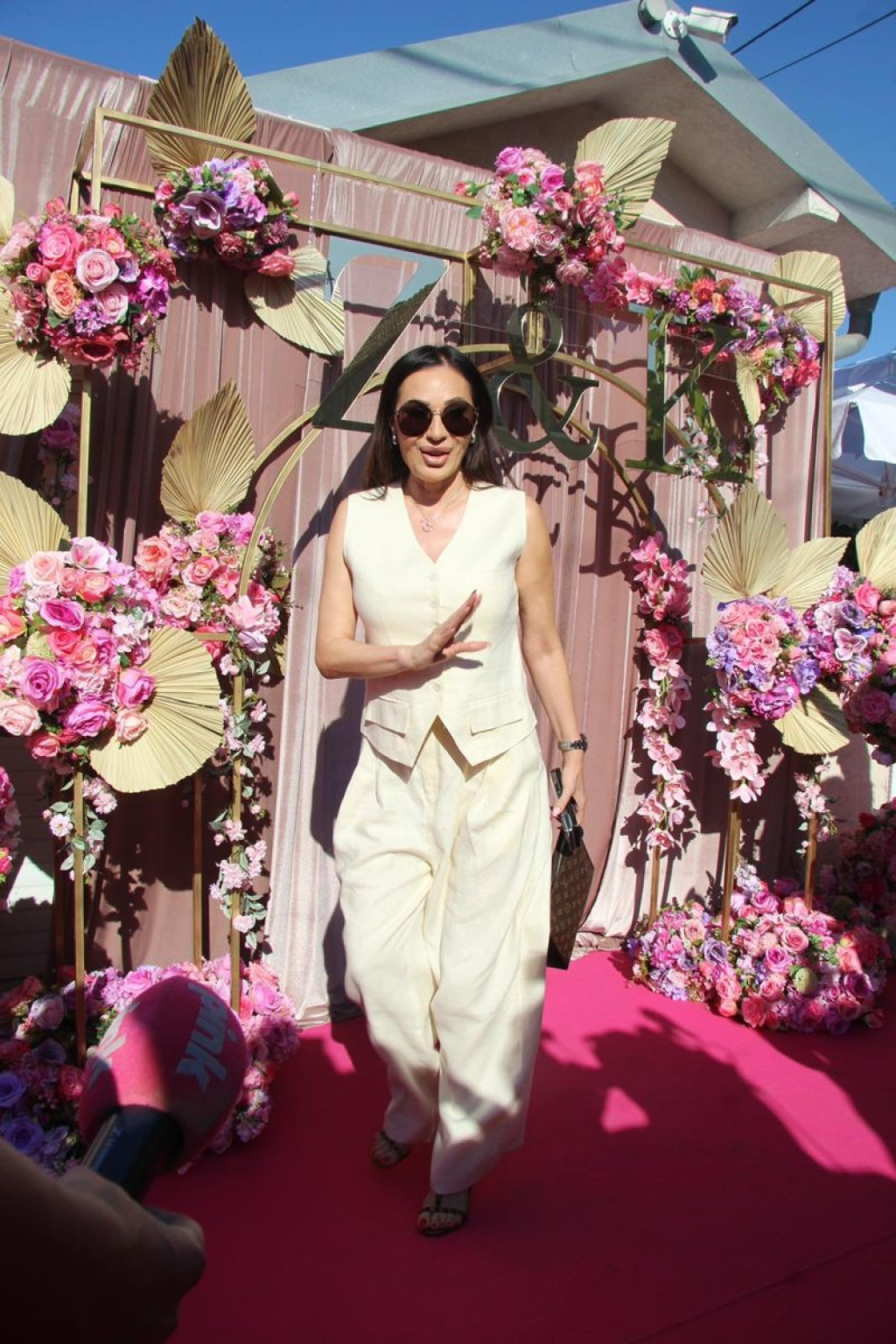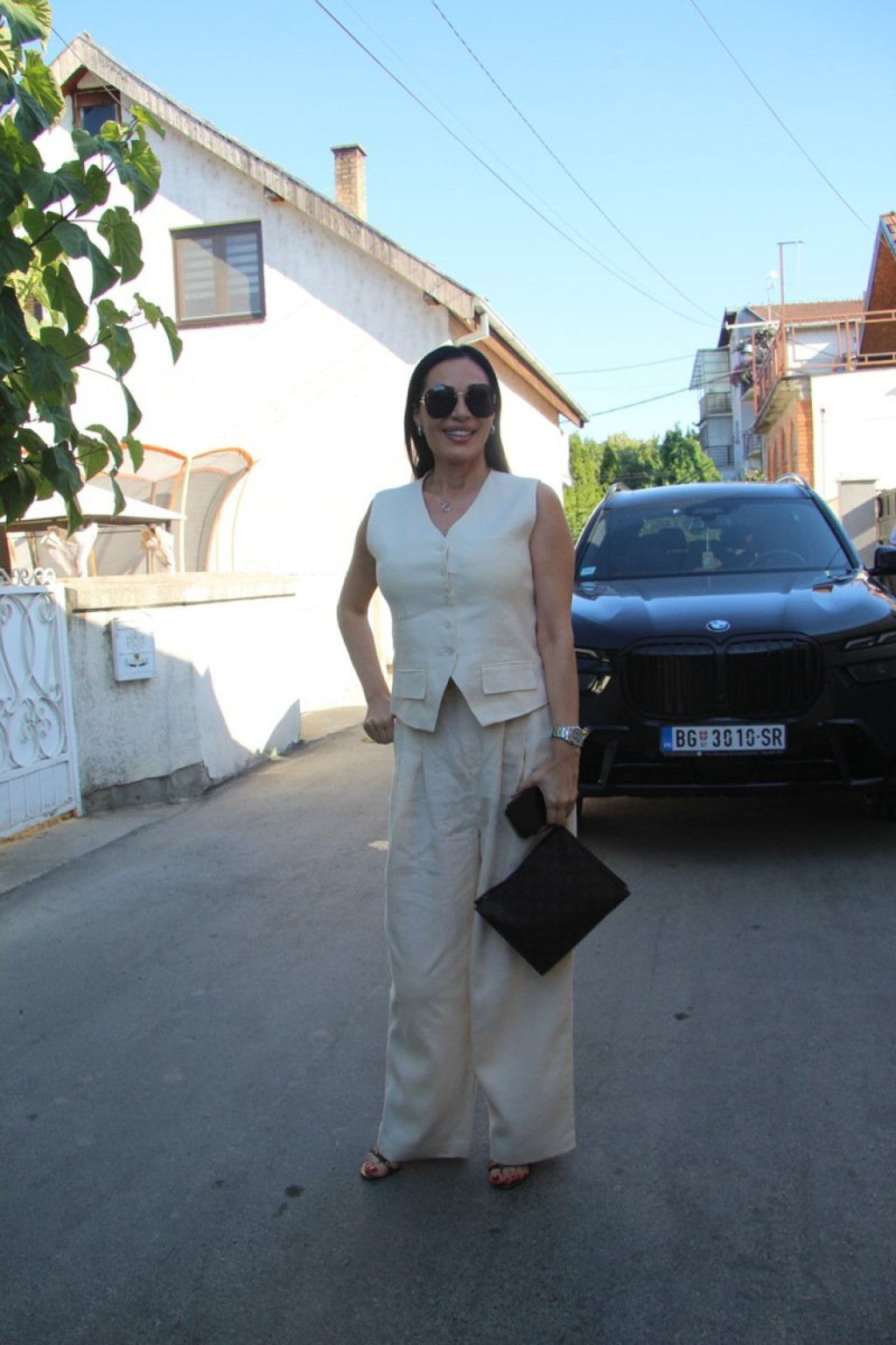 Za ovu svečanu priliku odabrala dvodelni komplet od lana, koji je isticao njenu figuru. Kombinaciju je upotpunila visokim potpeticama, dok je kao aksesoar ponela prepoznatljivu "luj viton" tašnicu.