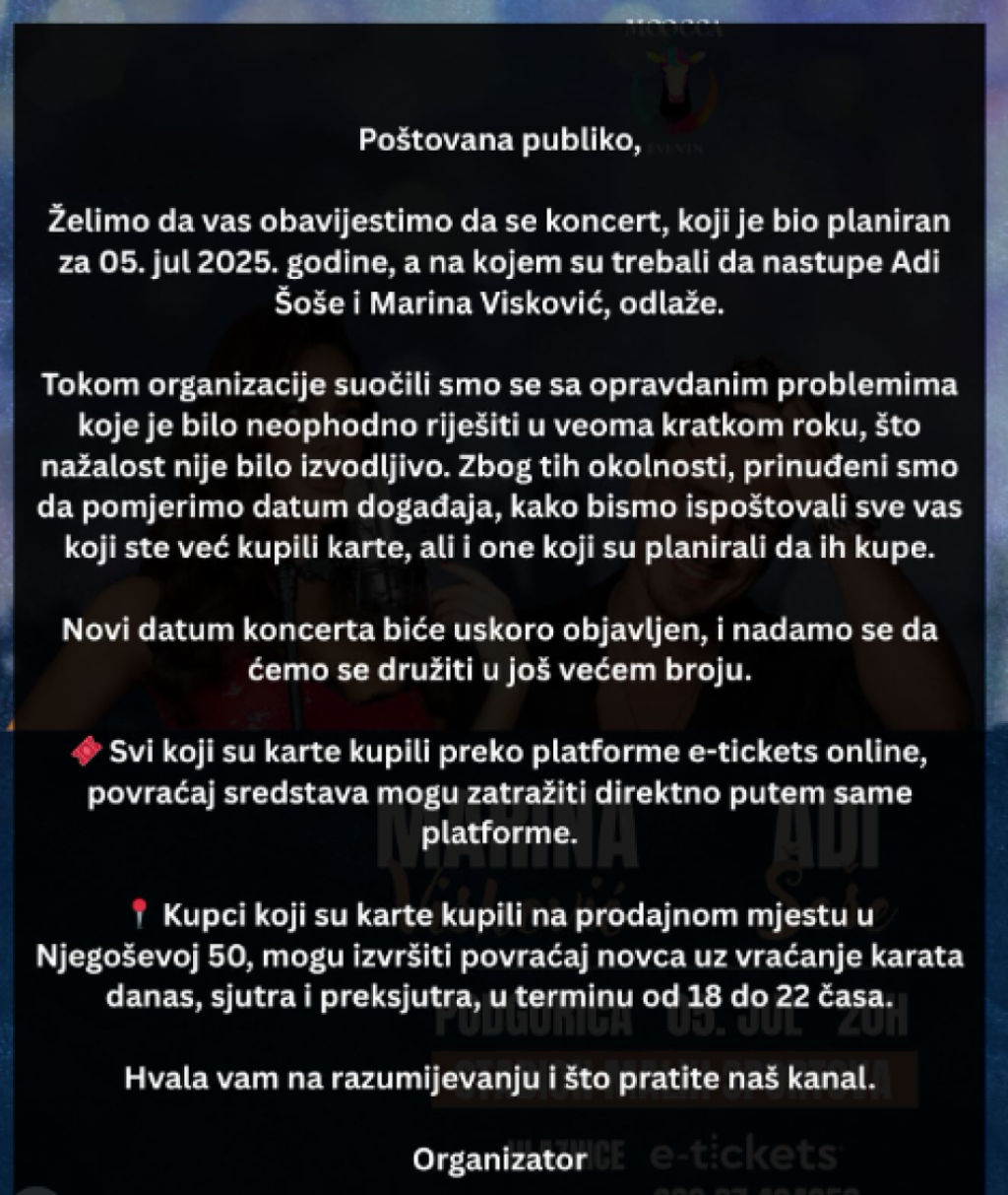 Organizatori su dali saopštenje u kom navode da zbog opravdanih problema, koje ne mogu da reše u kratkom roku, moraju da otkažu najavljivani koncert. Publika je masovno krenula da traži svoj novac nazad, a u saopštenju piše i na koju adresu mogu da se obrate kako bi im bila refundirana sredstva.