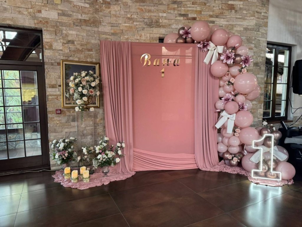 Dominiraju roze tonovi, a prostor krase velike ikebane na stolovima, baloni i pano za fotografisanje sa ispisanim imenom slavljenice.