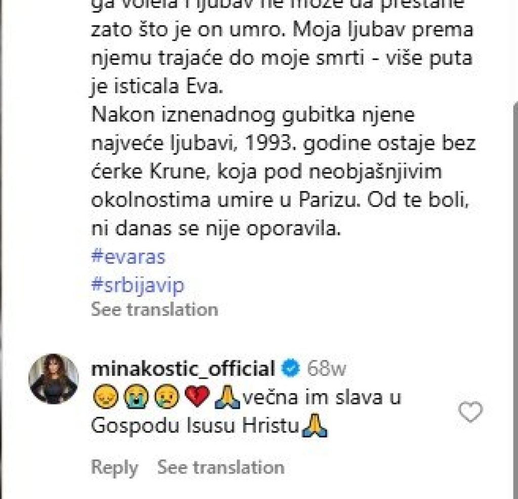 "Večna im slava u Gospodu Isusu Hristu", napisala je pevačica ispod fotografije na kojoj je Eva Ras i njen pokojni suprug Radomir Stević Ras.