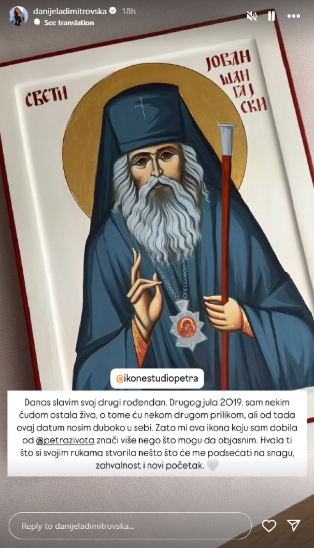 "Danas slavim svoj drugi rođendan. Drugog jula 2019. godine sam nekim čudom ostala živa, o tome ću nekom drugom prilikom, ali od tada ovaj datum nosim duboko u sebi. Zato mi ova ikona koju sam dobila od Petre znači više nego što mogu da objasnim. Hvala ti, što si svojim rukama stvorila nešto što će me podsećati na snagu, zahvalnost i novi početak", napisala je voditeljka na Instagramu.