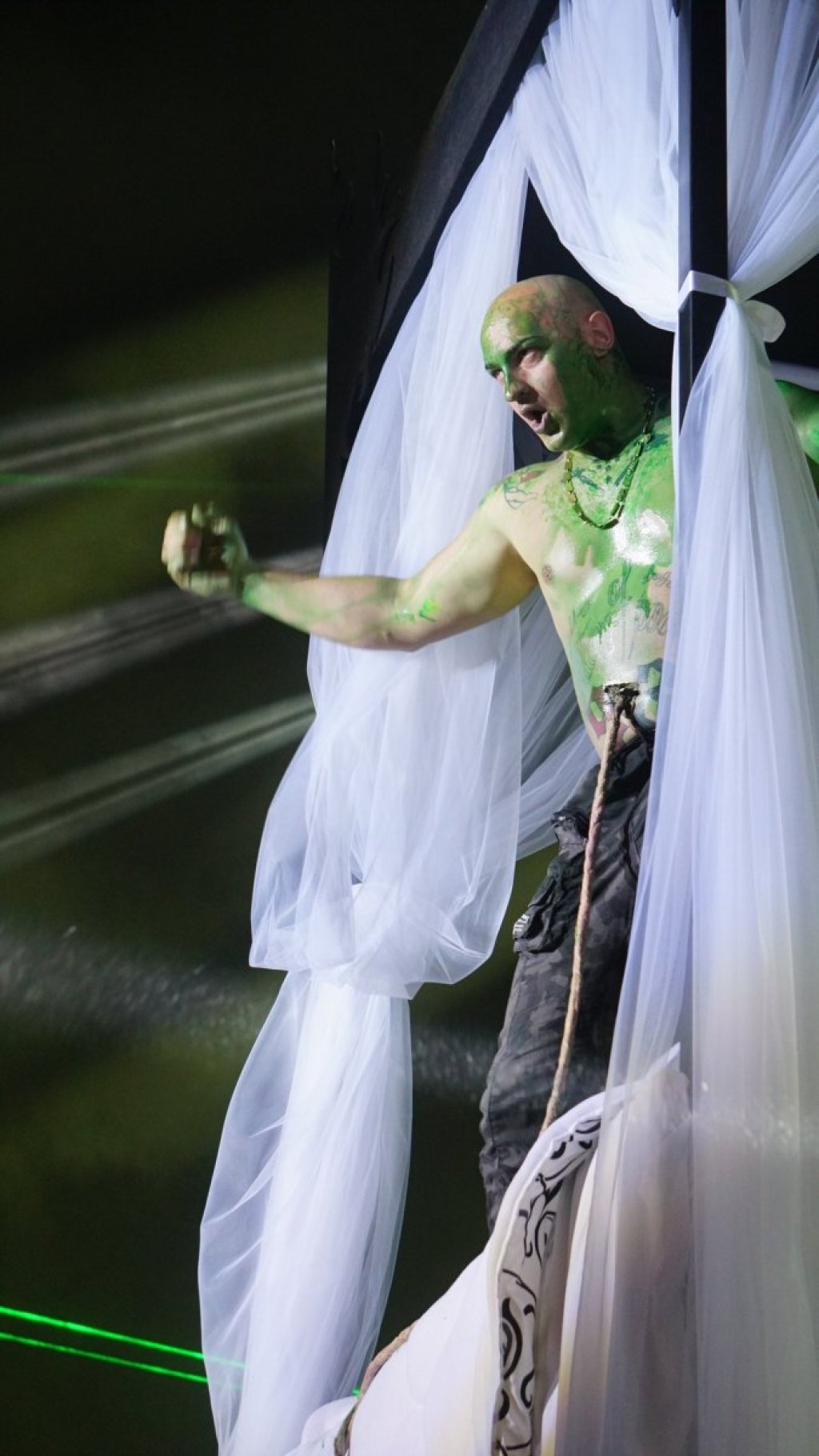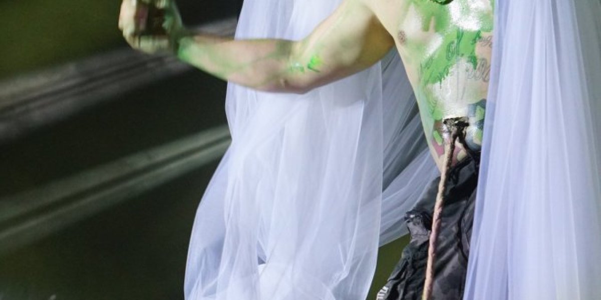 Bio je premazan zelenom farbom, a za stomak je imao prikačenu pupčanu vrpcu. Snimak se proširio društvenim mrežama, a mnogi su se zapitali da li je su ove scene primerene omladini, koja čini najveći deo Desingeričine publike.