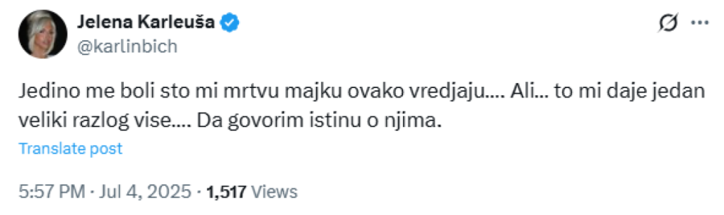 "Jedino me boli što mi mrtvu majku ovako vređaju...Ali...To mi daje jedan veliki razlog više... Da govorim istinu o njima", napisala je Karleuša na društvenoj mreži "X".