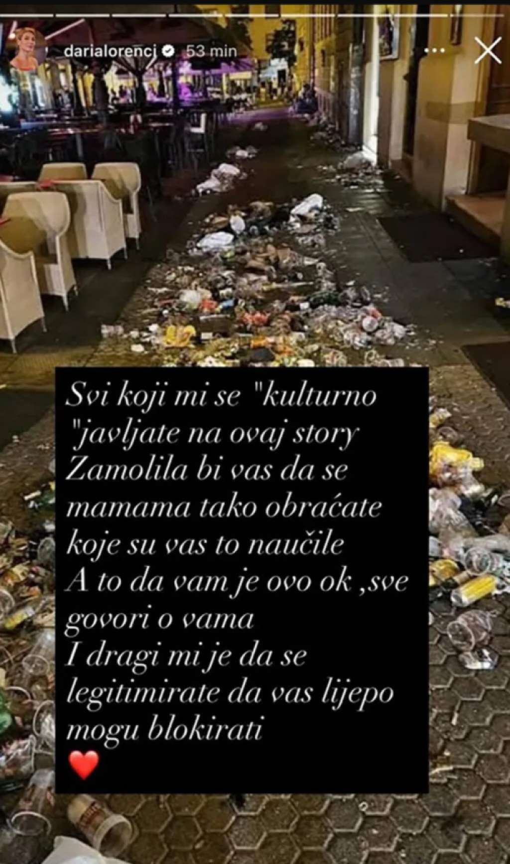 "Svi koji mi se 'kulturno' javljate na ovaj stori zamolila bih vas da se mamama tako obraćate koje su vas to naučile. A to da vam je ovo ok, sve govori o vama. I drago mi je da se legitimišete da vas lepo mogu blokirati", napisala je ona u storiju", prikazavši sav jad na ulicama od smeća.