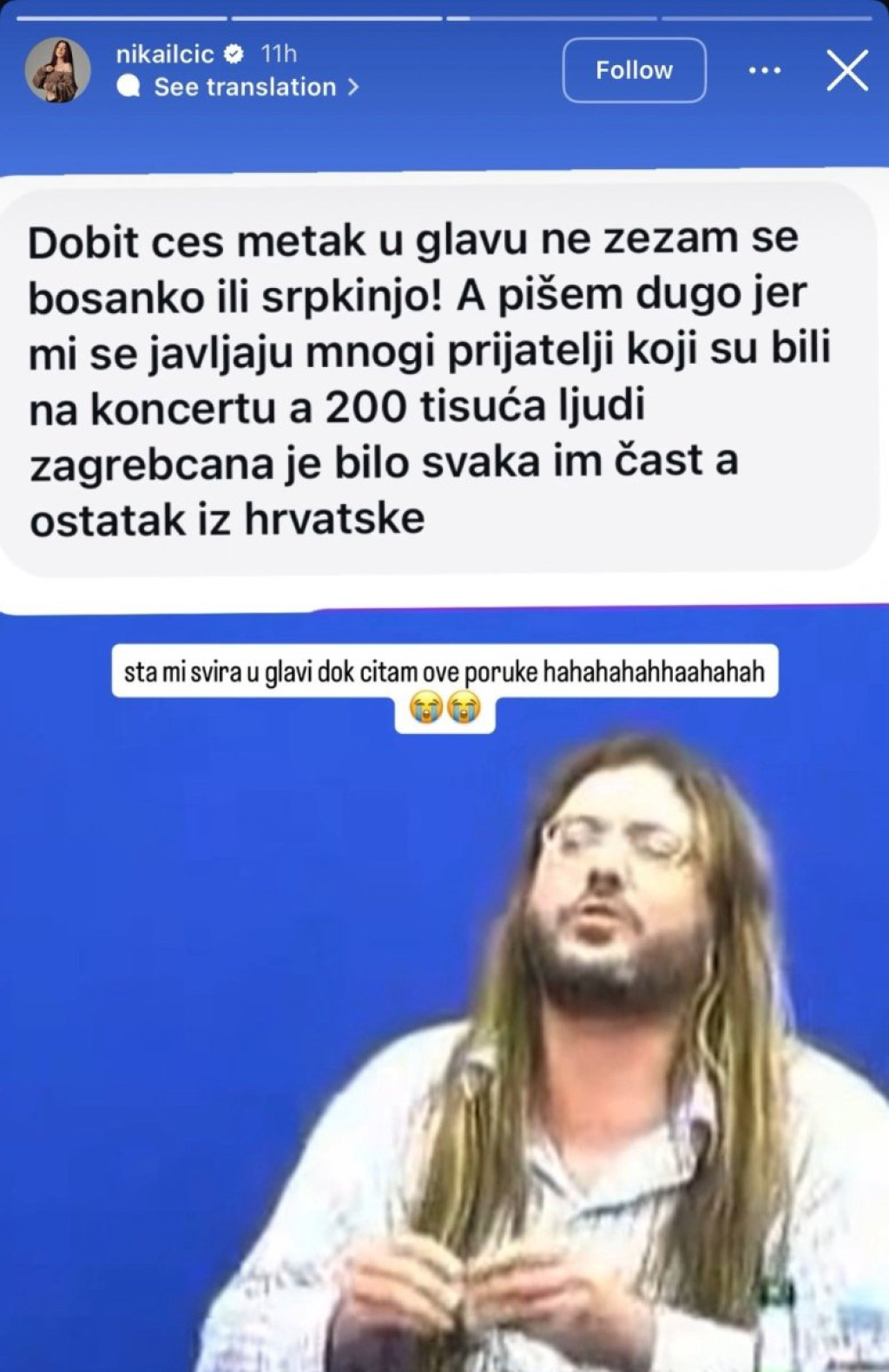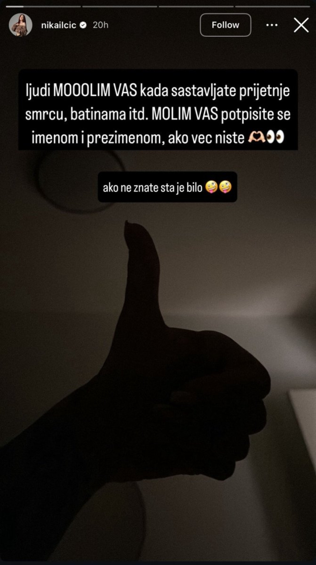 "Ljudi, molim vas, kada sastavljate pretnje smrću, batinama itd, molim vas, potpišite se imenom i prezimenom, ako već niste. Ako ne znate šta je bilo", napisala je Nika Ilčić.
