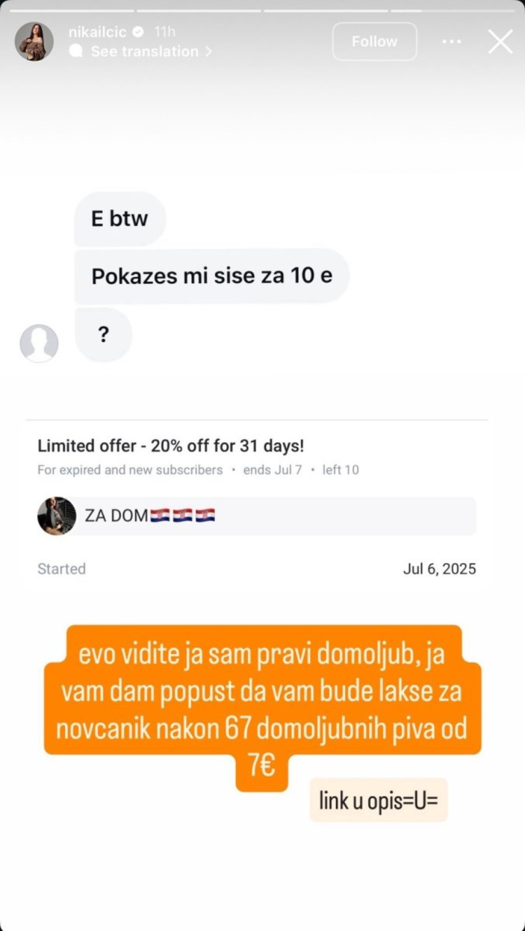 "Morala sam otići iz Zagreba jer koji k***c, al iskreno, srce mi je ko kuća kad vidim po Zagrebu 500.000 ljudi koji će jednom doći i odbraniti Hrvatsku i doslovno će se tući za prvi red na frontu od želje da odbrane dom za koji su spremni (ali, ne žive u njemu jer imaju drugi u kom je plata veća i vozi se jača mečka, te opet ima pravo da glasa)", napisala je ona juče na svom Instagram profilu, pa dodala: