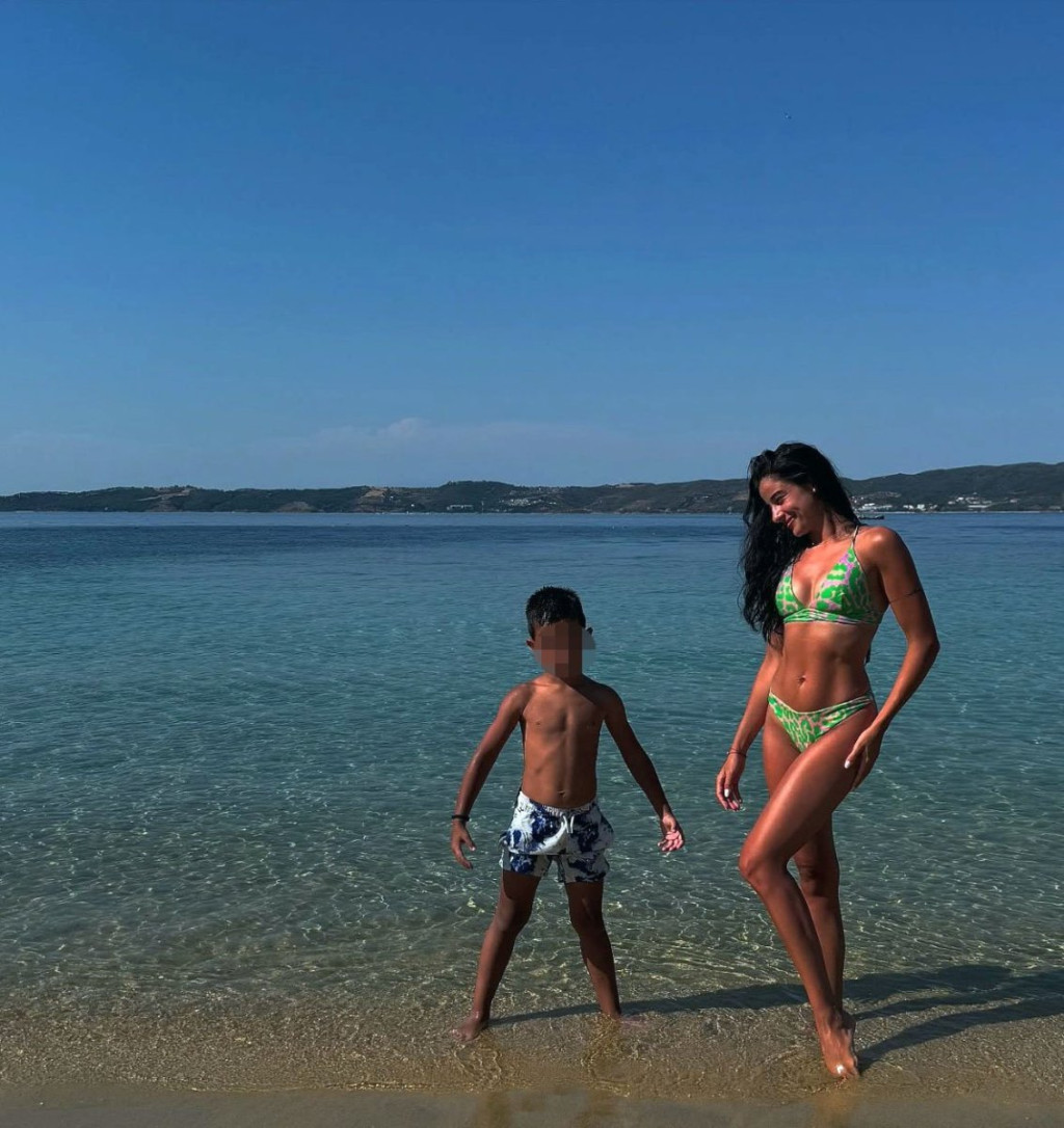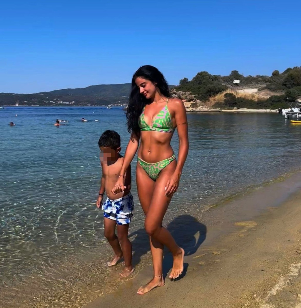 Naime, ponosna mama je pozirala sa naslednikom u izazovnom, zelenom, kupaćem koji je istakao sve njene obline i atribute - prirodne grudi, izvajan stomak, duge noge bez trunke celulita.