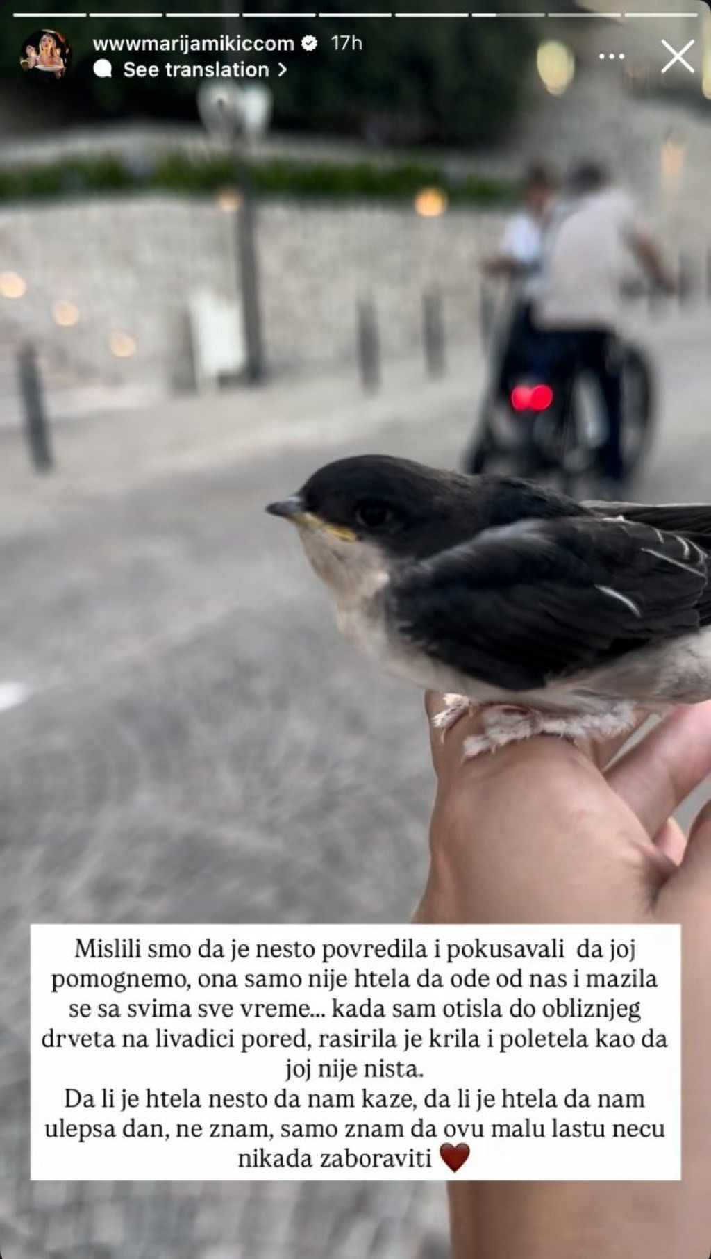 "Da li je htela nešto da nam kaže, da li je htela da nam ulepša dan, ne znam, samo znam da ovu malu lastu neću nikada zaboraviti".