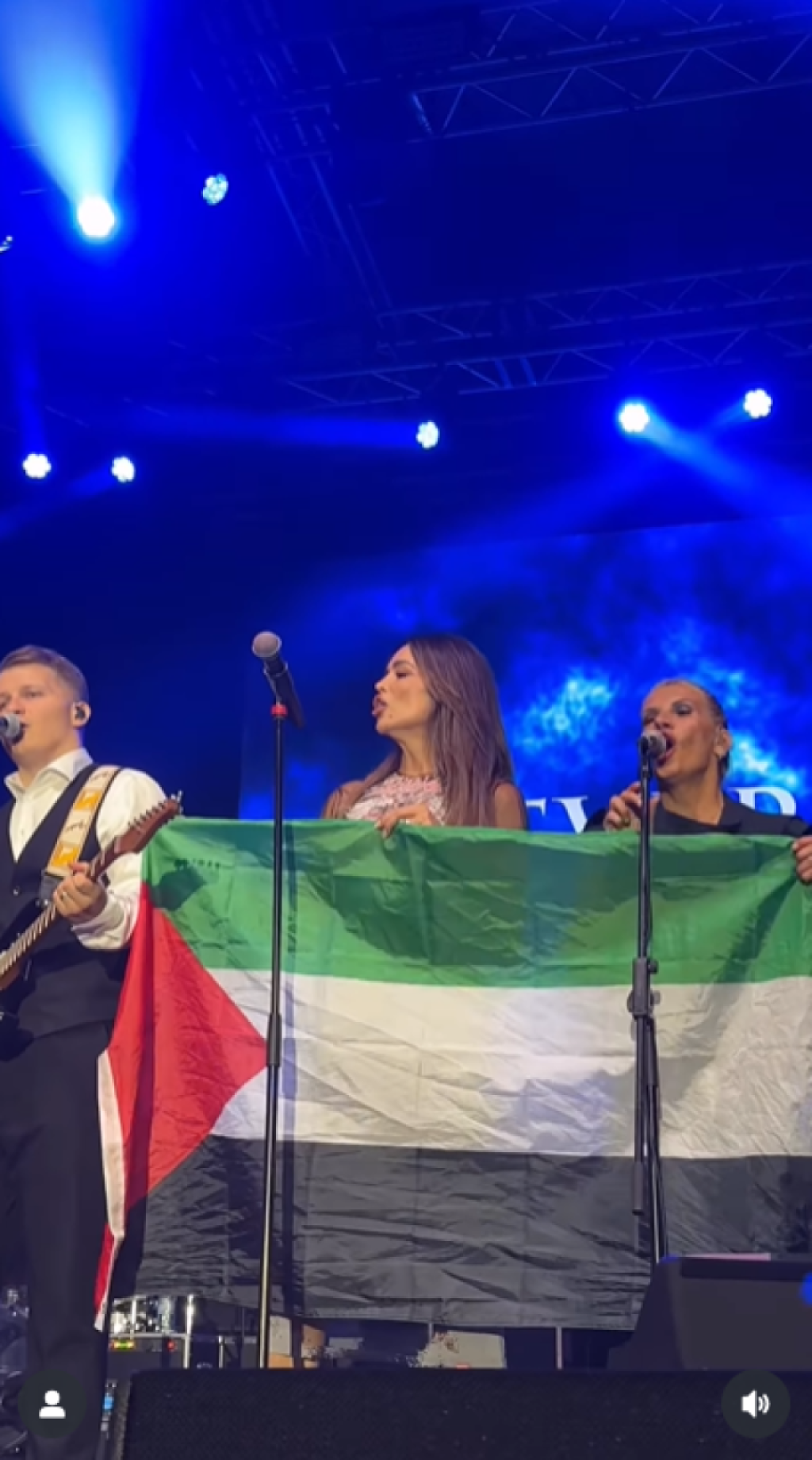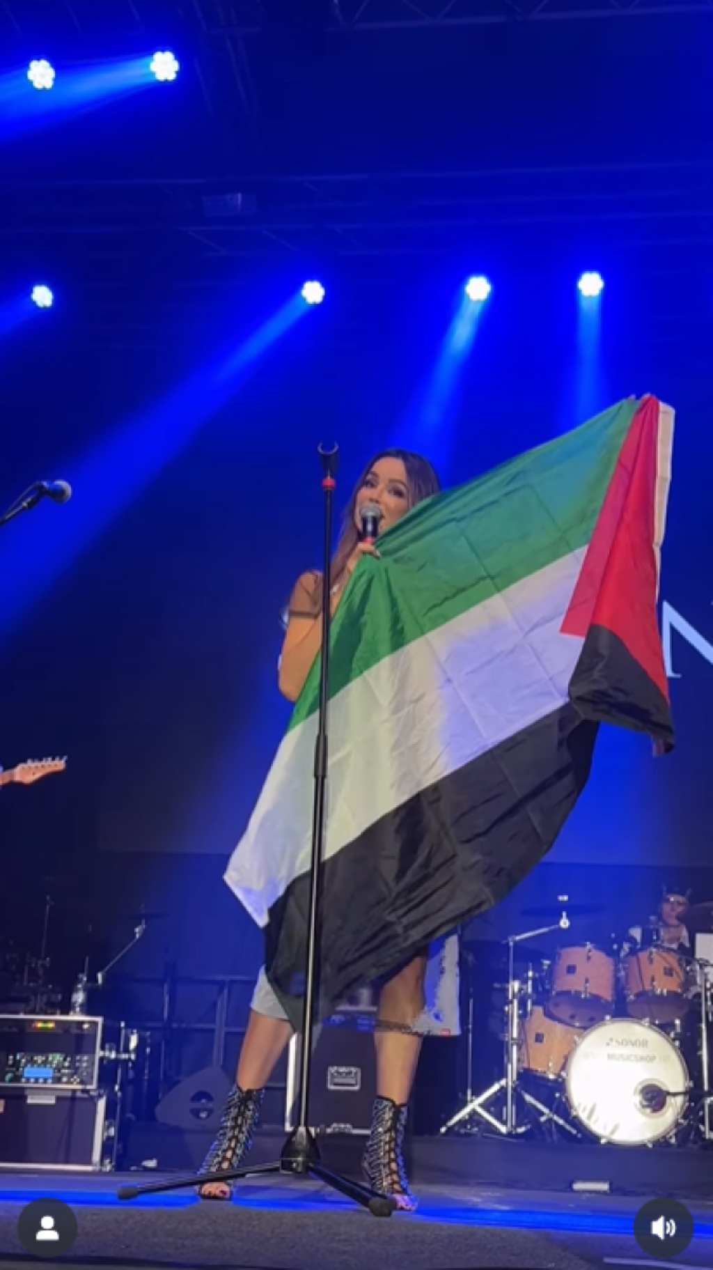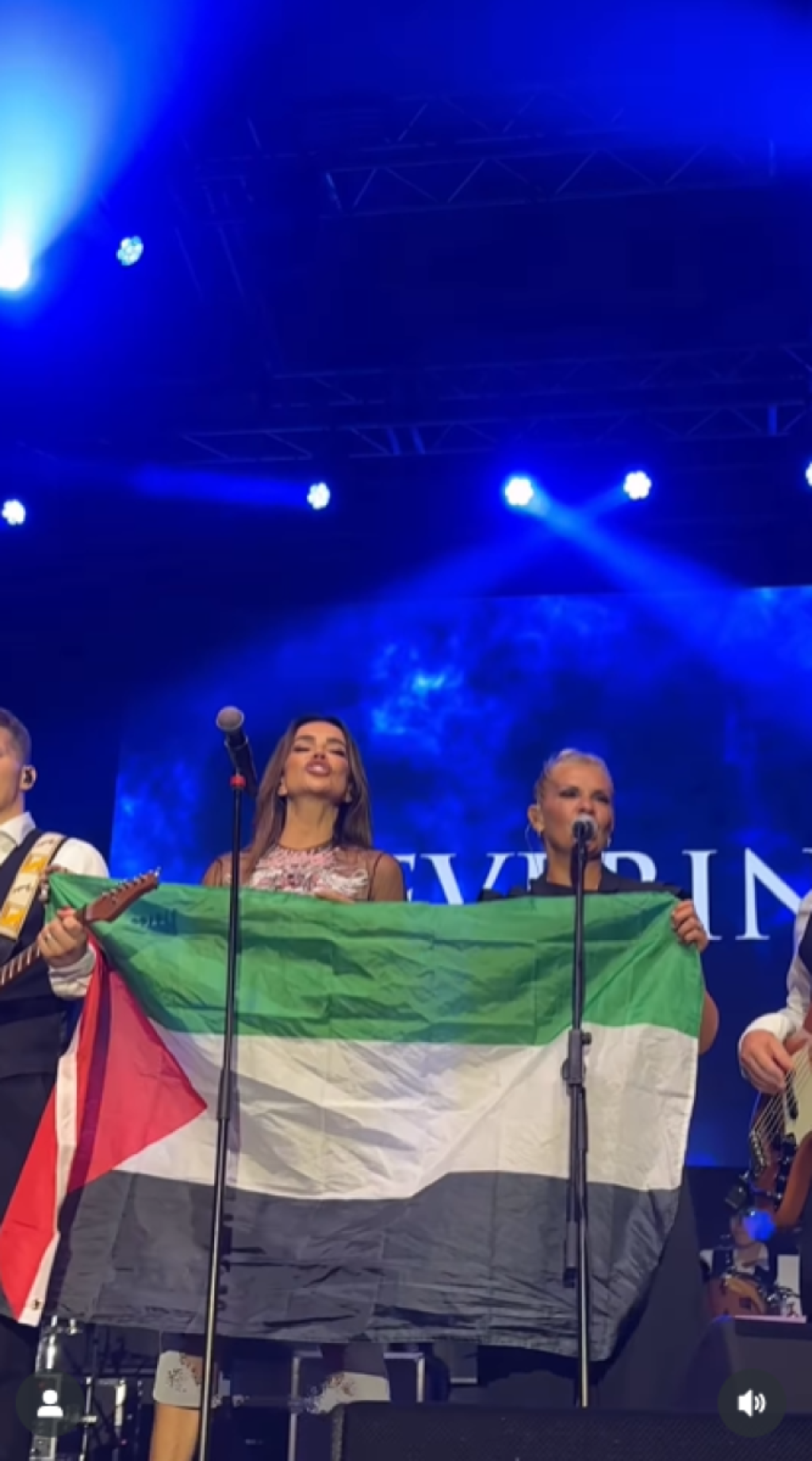 Približila joj se, a devojka joj je dodala zastavu. Vrativši se za mikrofon, nastavila je da peva sa raširenim obeležjem.