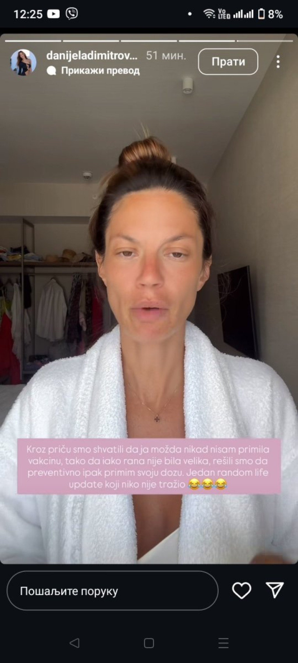 "Kroz priču smo shvatili da ja možda nikada nisam primila vakcinu, tako da iako rana nije bila velika, rešili smo da preventivno ipak primim svoju dozu. Jedan random life update koji niko nije tražio", napisala je ona.