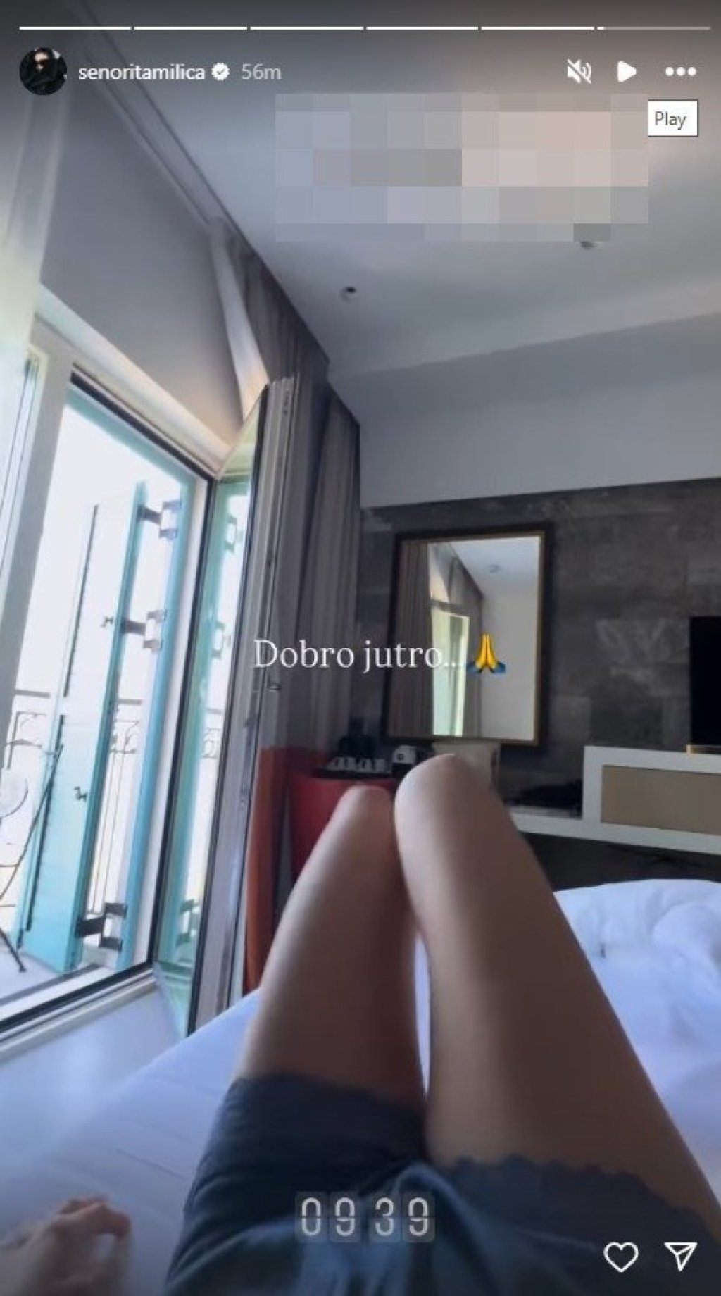 Pevačica se najpre baškarila u krevetu, a onda je ustala i krenula ka balkonu koji gleda pravo na more. Na sebi je imala samo svilenu kratku spavaćicu koja u kobinaciji sa čipkom daje dodatnu dozu seksipila.