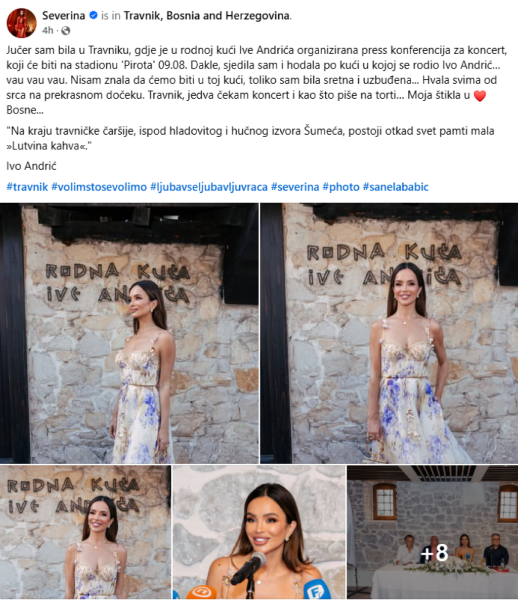 "Juče sam bila u Travniku, gde je u rodnoj kući Iva Andrića organizovana pres-konferencija za koncert, koji će se održati na stadionu "Pirota" 9. avgusta. Dakle, sedela sam i hodala po kući u kojoj se rodio Ivo Andrić... Vau, vau, vau! Nisam znala da ćemo biti u toj kući, toliko sam bila srećna i uzbuđena... Hvala svima od srca na prekrasnom dočeku. Travnik, jedva čekam koncert i kao što piše na torti... Moja štikla u srcu Bosne", napisala je Vučkovićeva, a objava na Fejsbuku ubrzo je preplavljena komentarima: