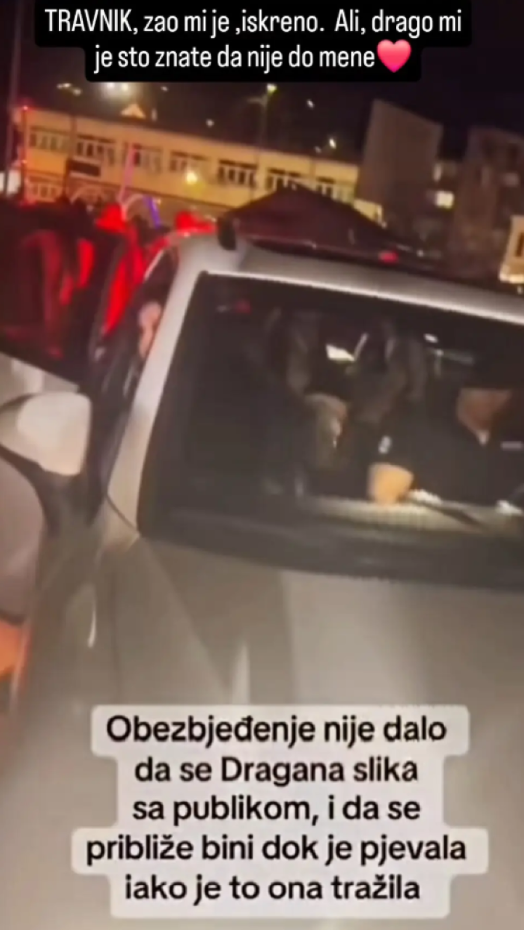 Na snimku koji je dospeo u javnost jasno se vidi kako Dragana objašnjava fanovima da bi rado ostala da se slika sa svima, ali da njeno obezbeđenje radi svoj posao i da je morala hitno da uđe u automobil.